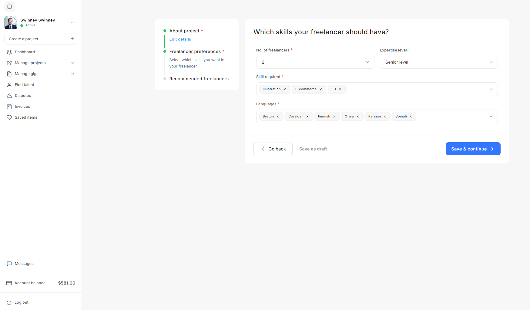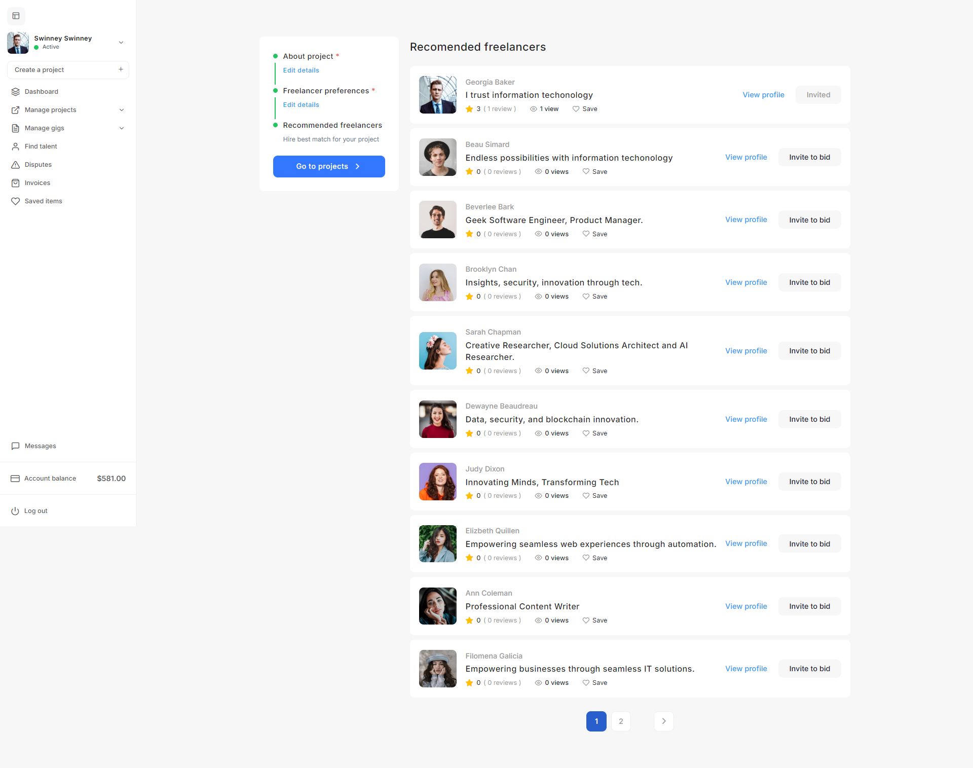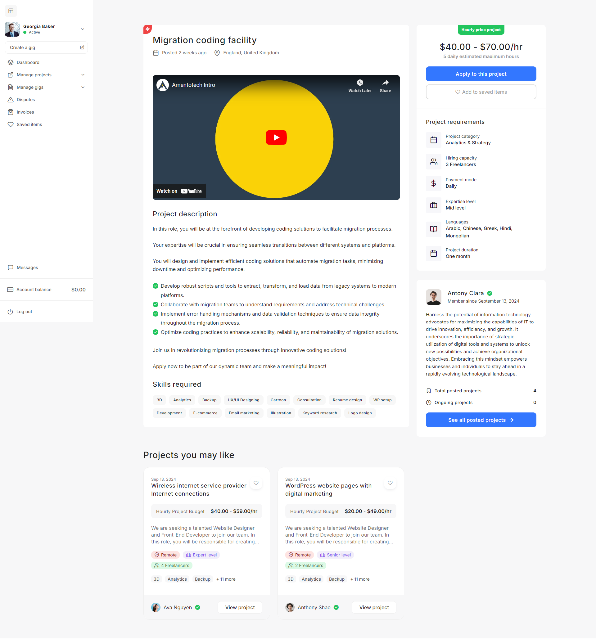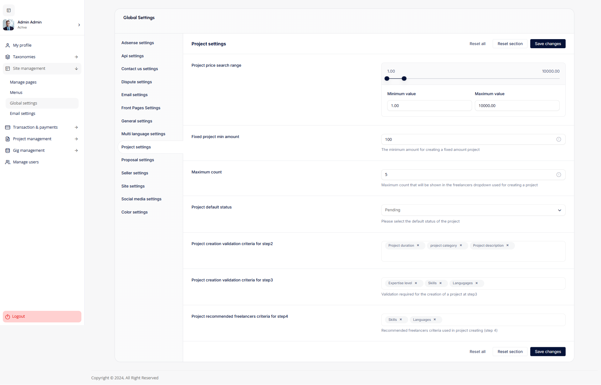 - Project Settings: The Project settings allow admins to define project budgets, default statuses, creation validation criteria, and freelancer recommendation parameters to streamline project management on the platform.