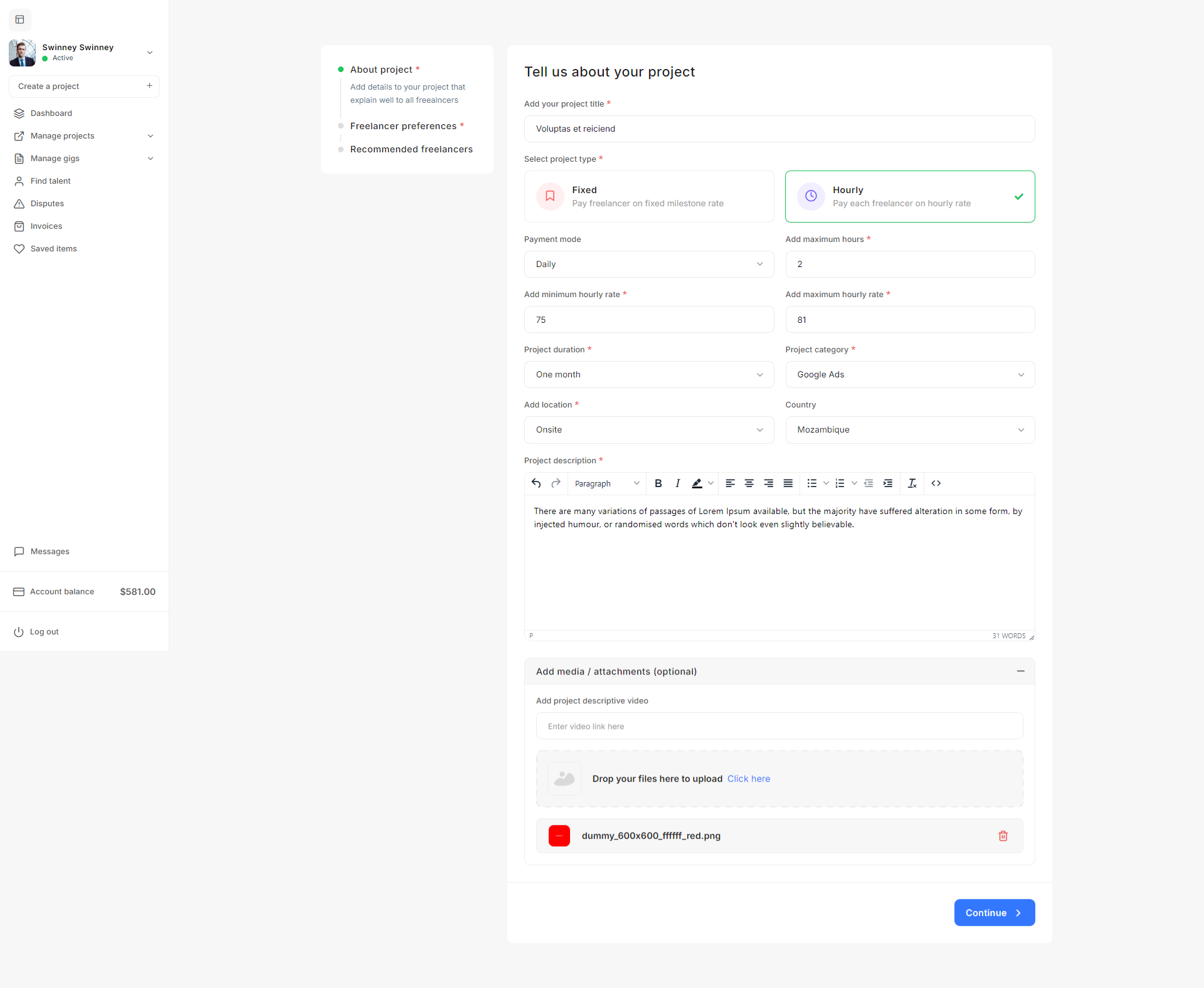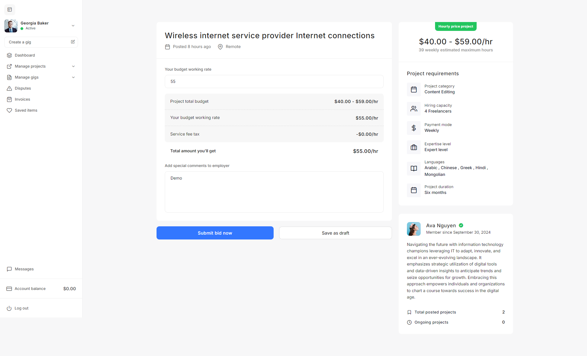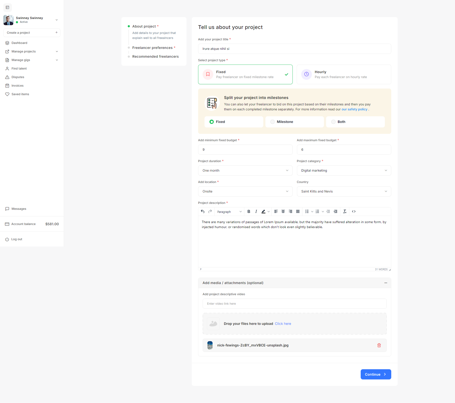 - Project Settings: The Project settings allow admins to define project budgets, default statuses, creation validation criteria, and freelancer recommendation parameters to streamline project management on the platform.