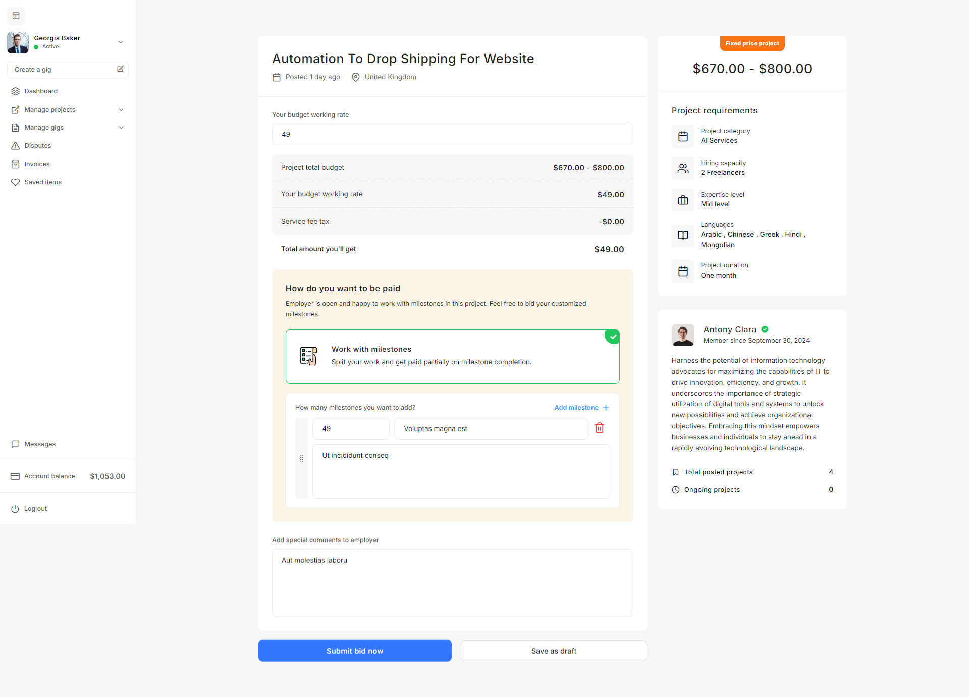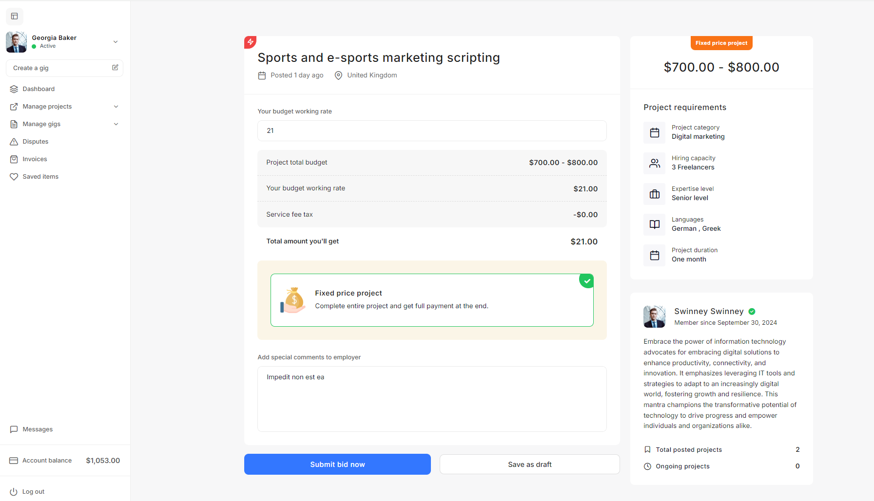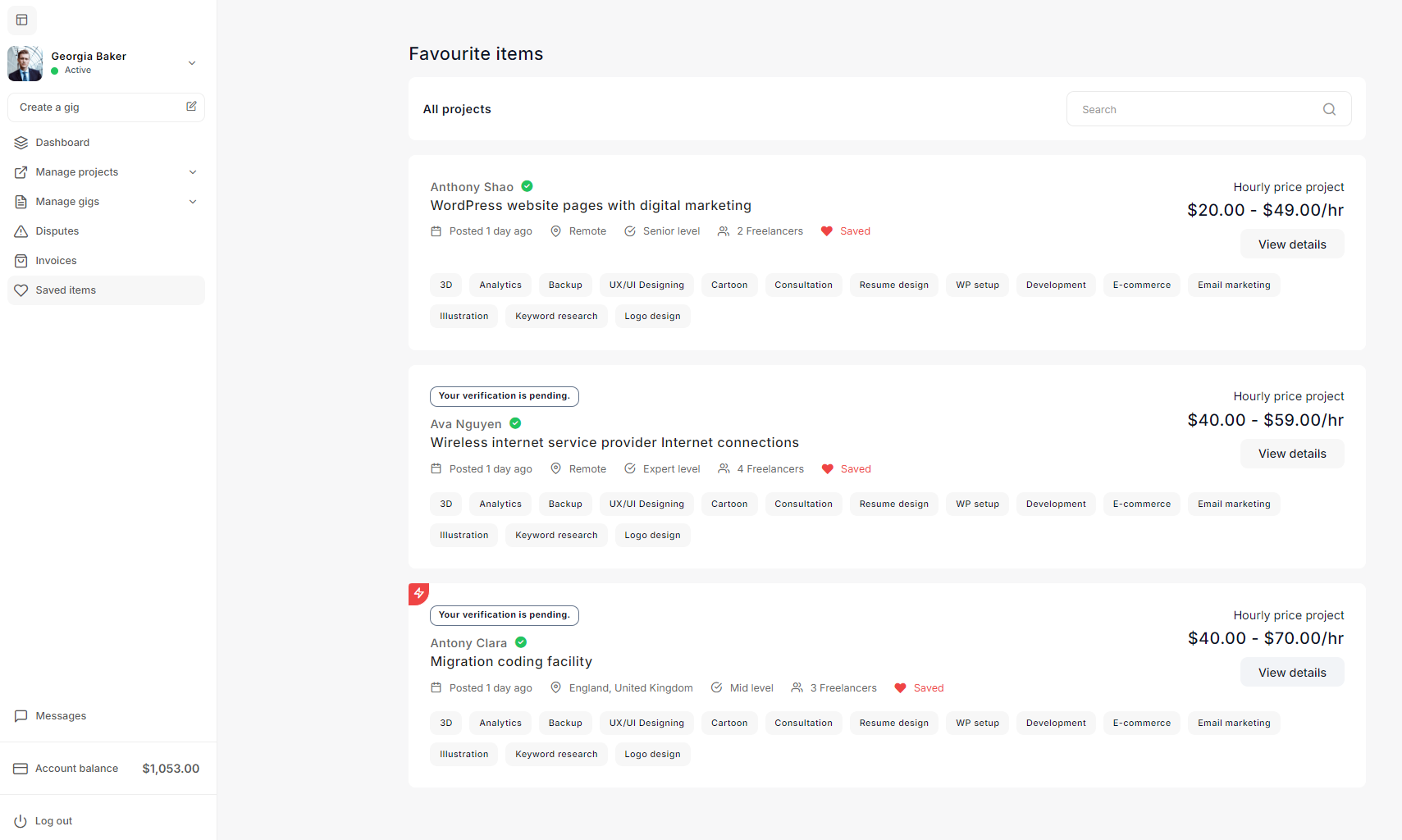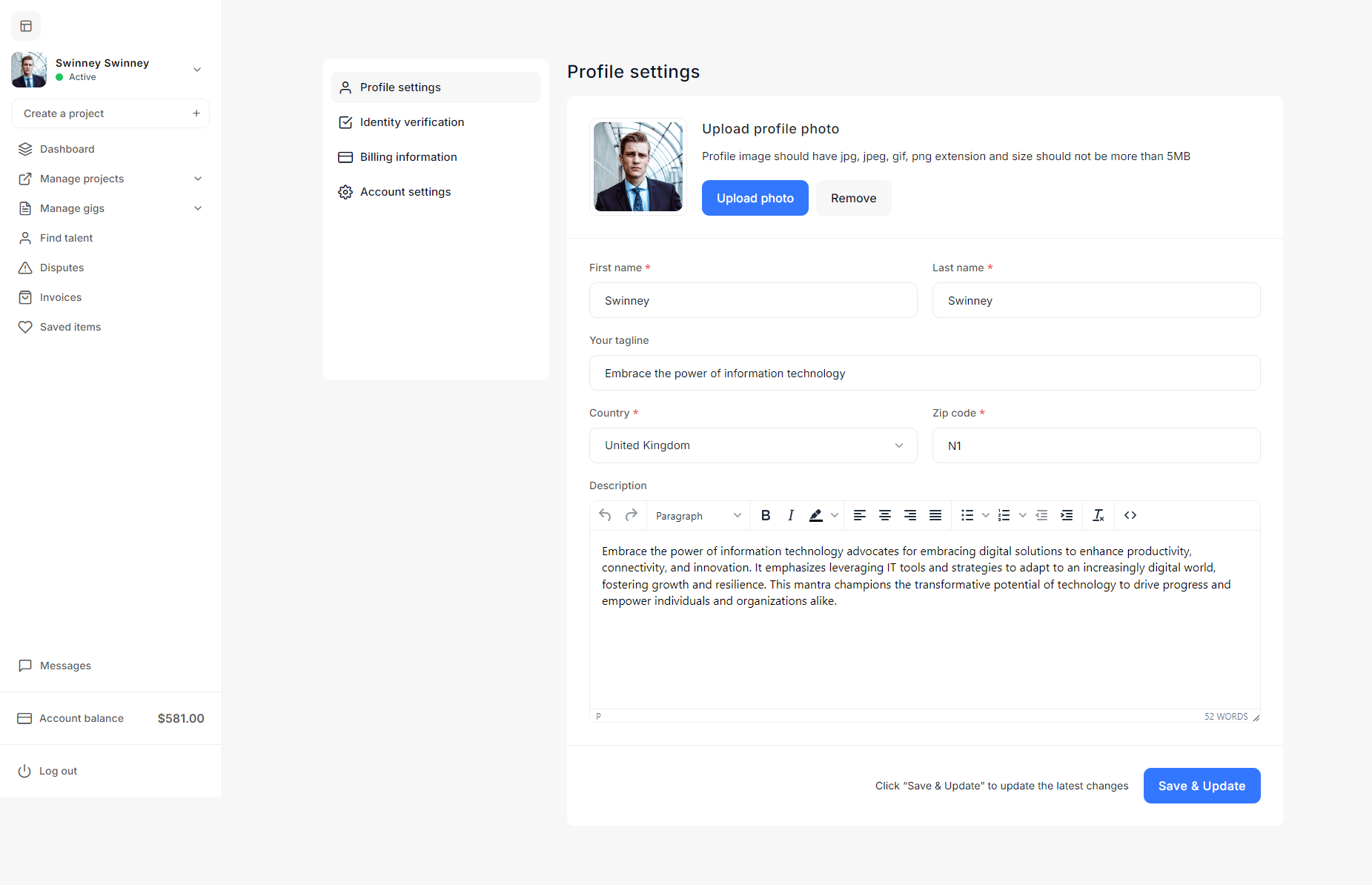 - Project Settings: The Project settings allow admins to define project budgets, default statuses, creation validation criteria, and freelancer recommendation parameters to streamline project management on the platform.