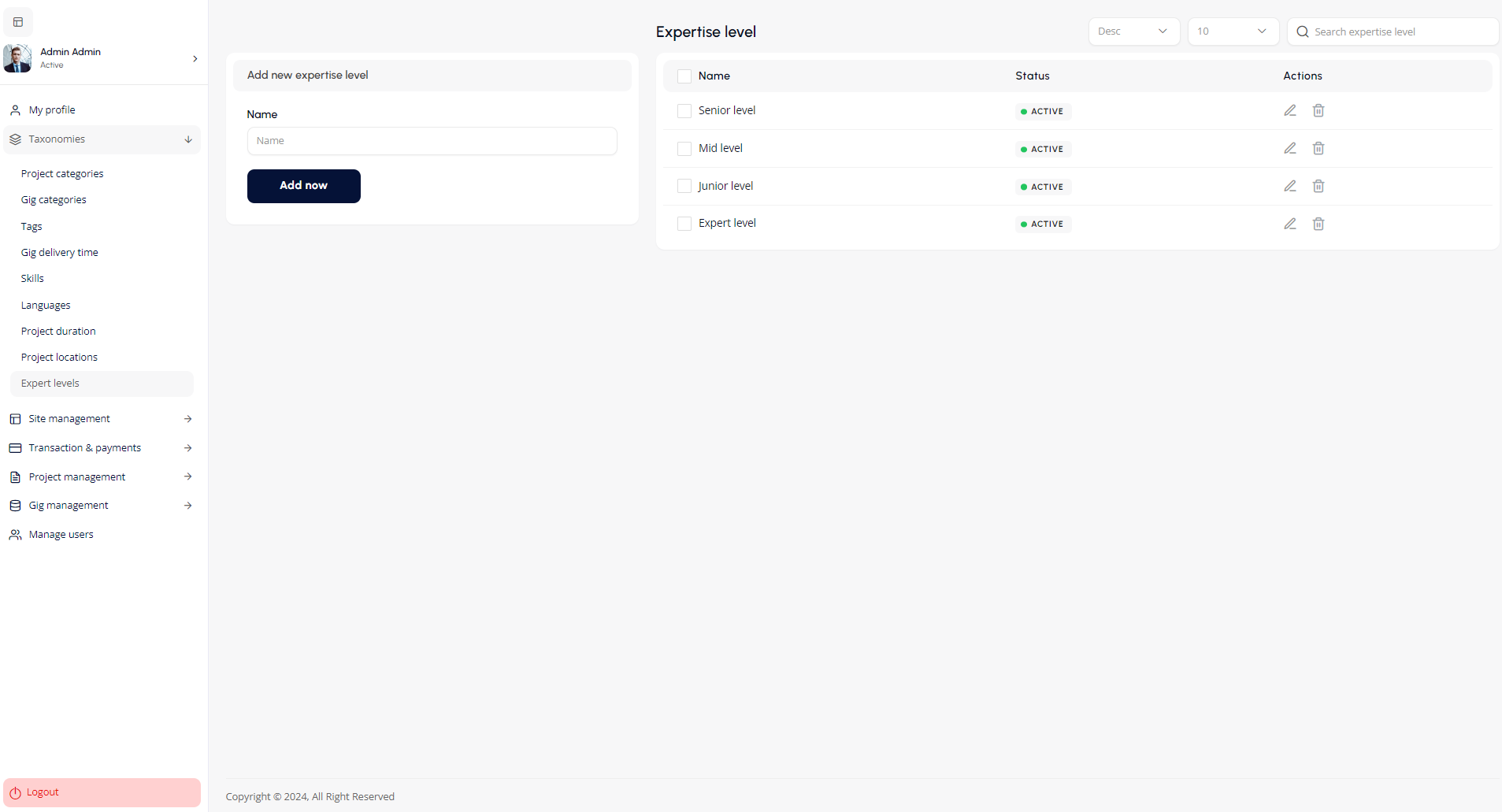 - Filter the list of expertise levels based on different criteria such as name or status for easier management.