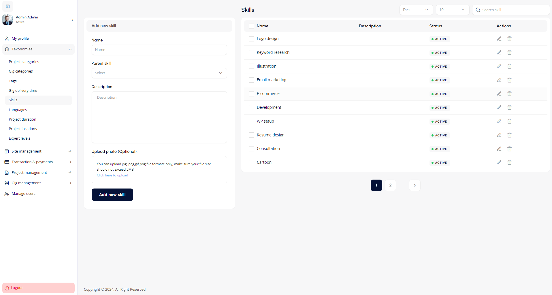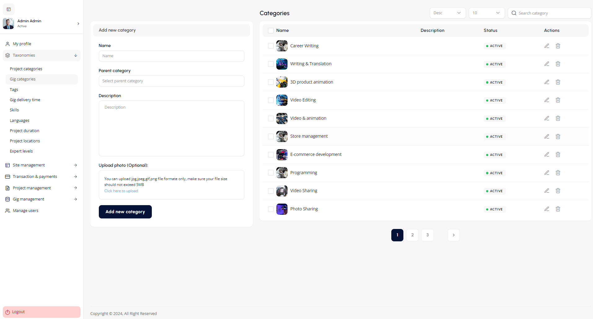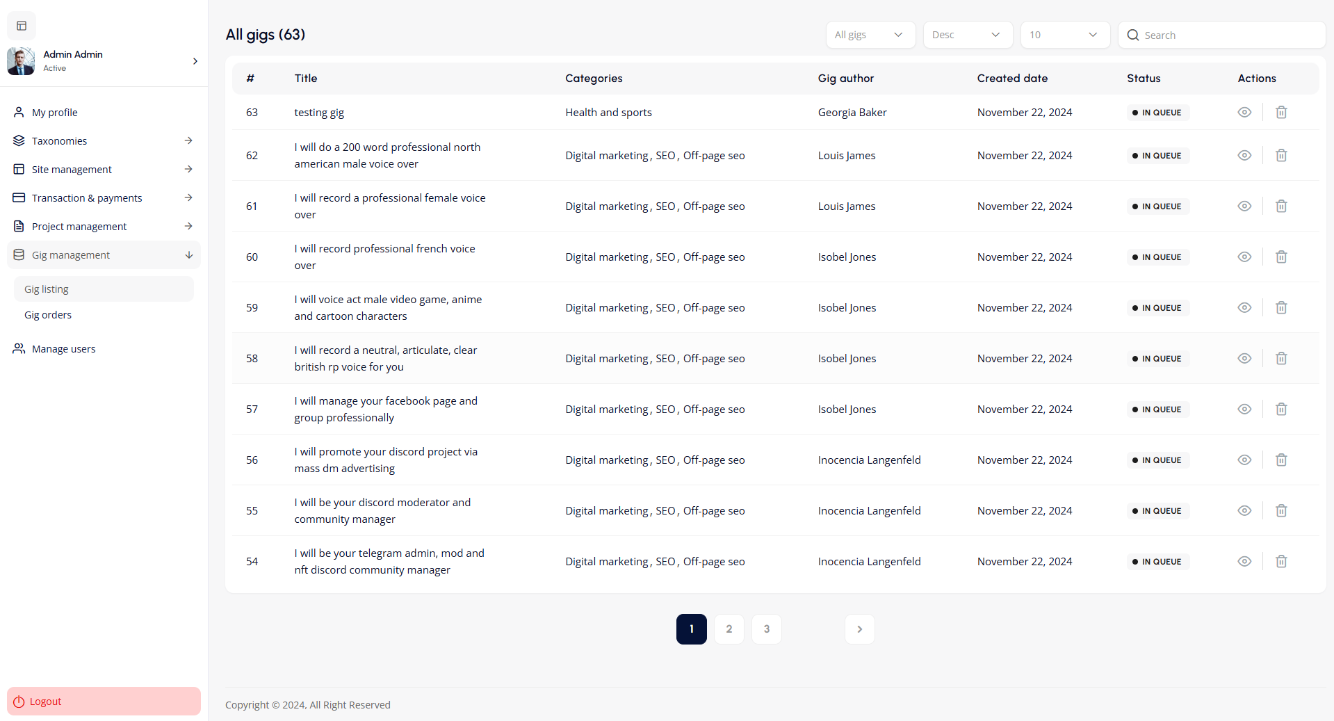 The All Gigs screen provides an overview of gig listings with details like title, category, author, creation date, and status. Admins can view or delete gigs using action icons. Filtering, sorting, and search options ensure easy navigation, while pagination supports large gig volumes. The sidebar links to gig and platform management tools.