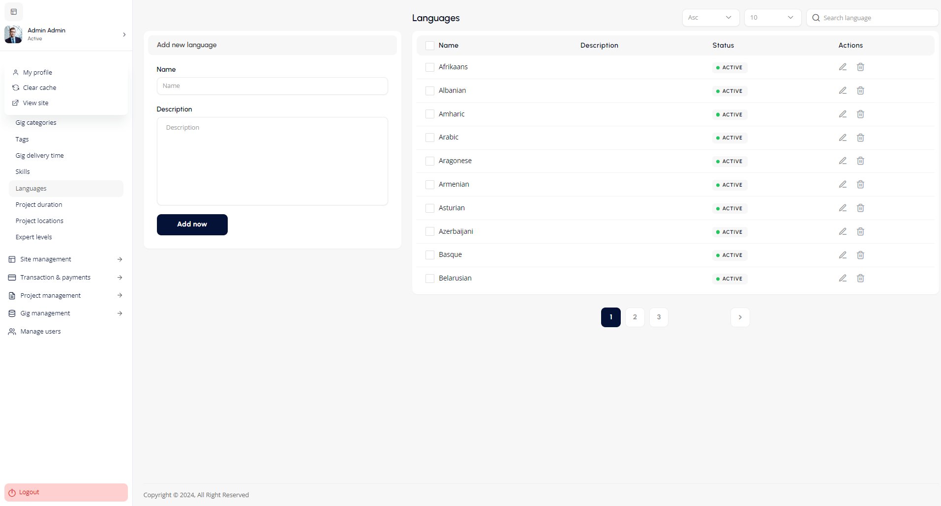 - Click Add now to make it available for freelancers to select when creating or updating their profiles.
