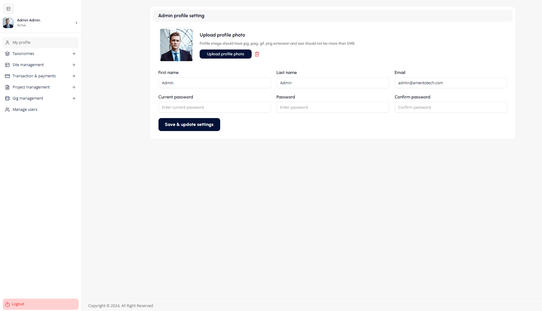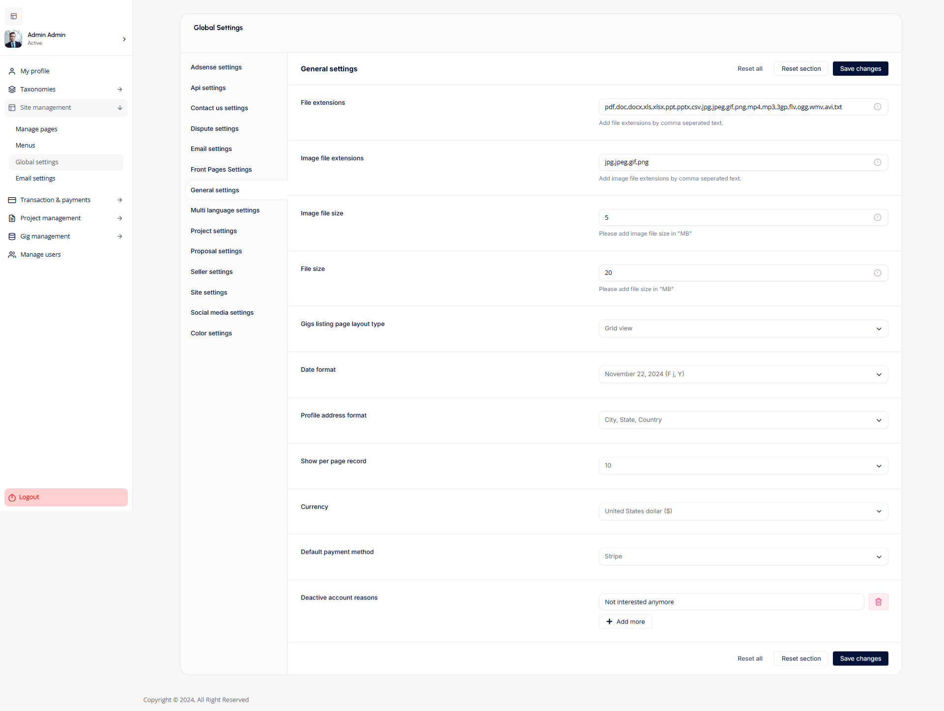 - General Settings: The General Settings allow admins to configure key platform preferences, such as supported file extensions, file size limits, date formats, currency, and default payment methods. It also includes layout settings, profile address formatting, and reasons for account deactivation.