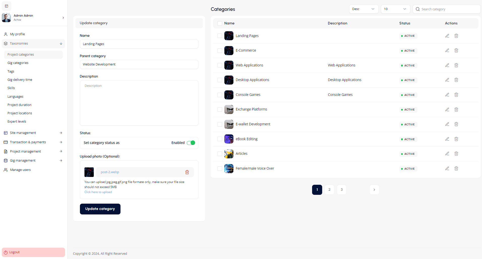 The Project Management section enables the admin to manage all project related activities on the platform.