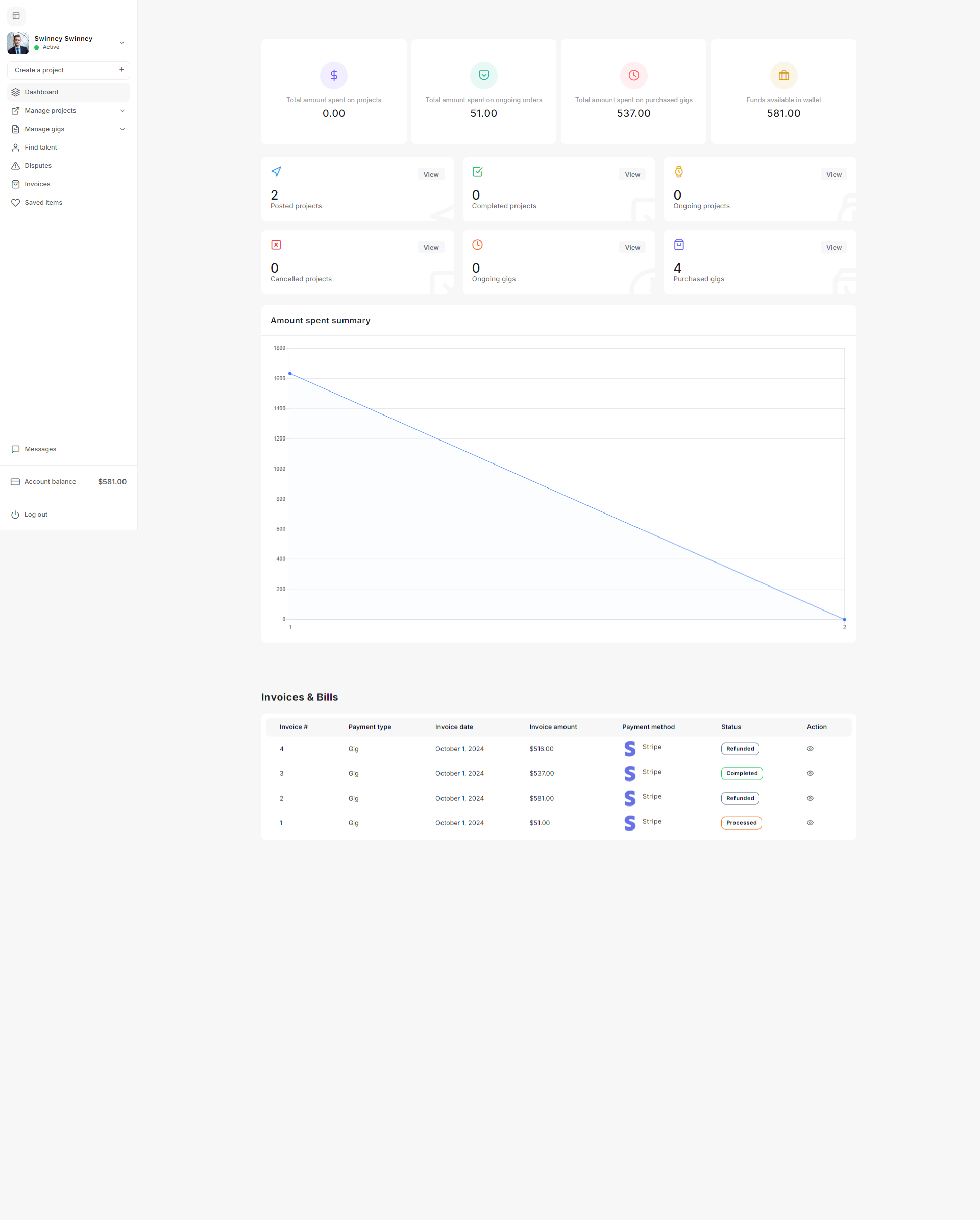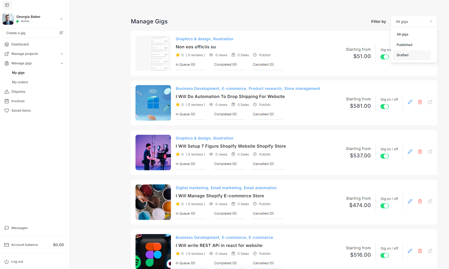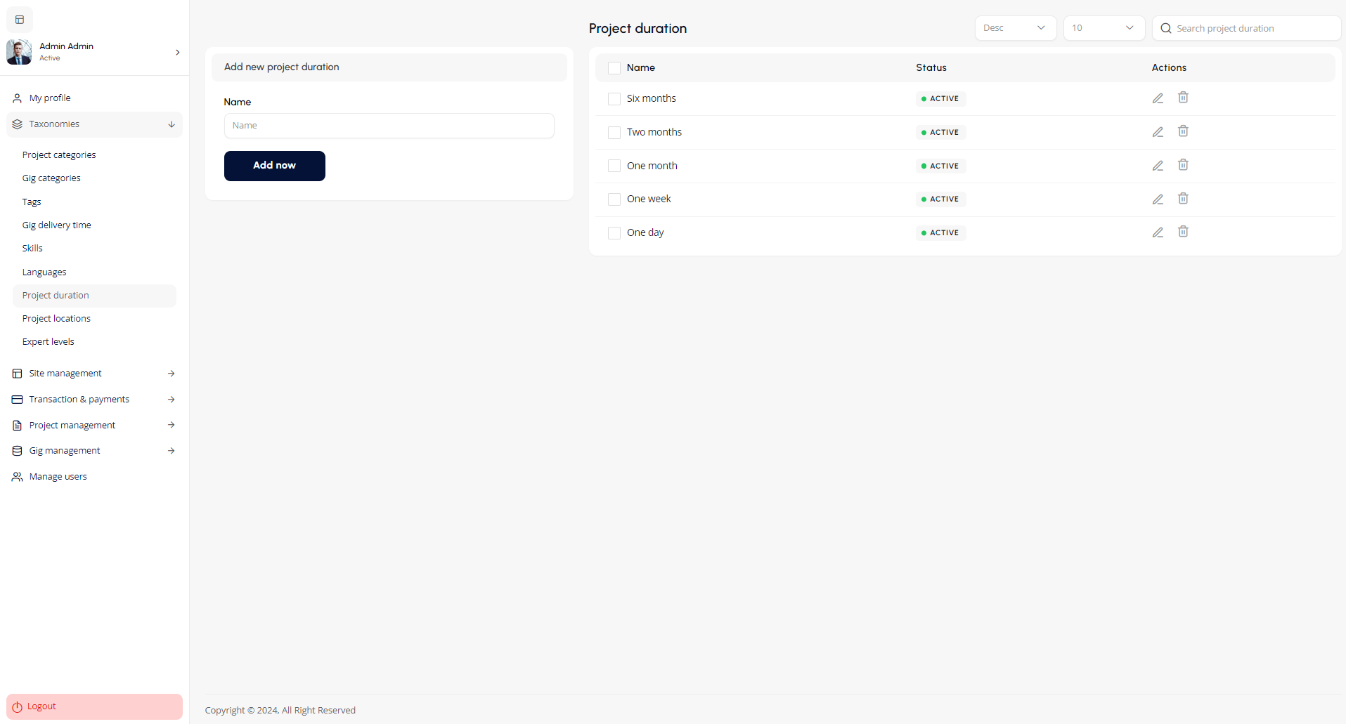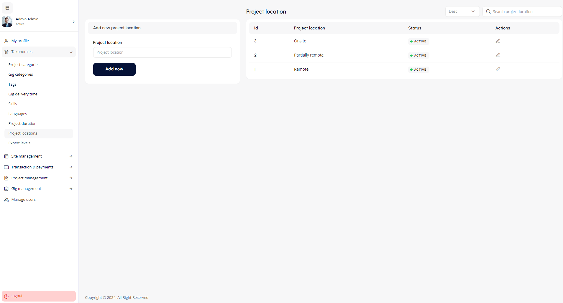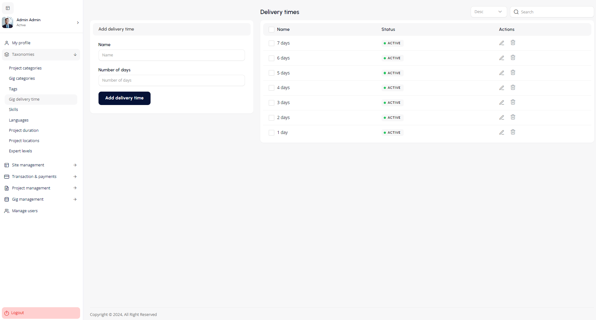 The Gig Management section enables the admin to manage all gig related activities on the platform.