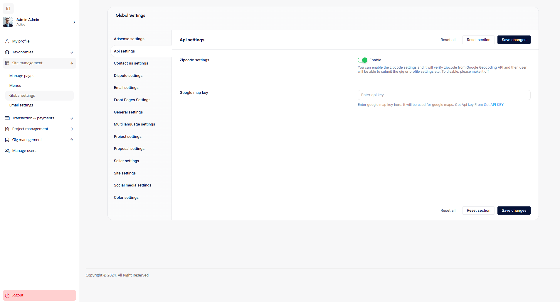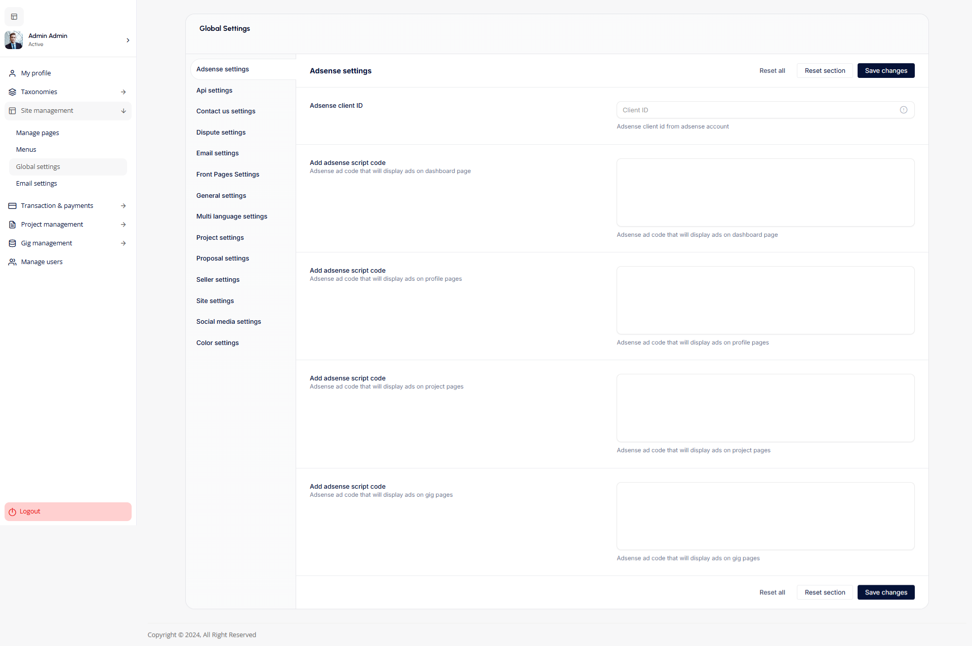 - Adsense Settings: Configure AdSense settings panel allows admins to configure and integrate AdSense ads on various platform pages, such as dashboards, profiles, projects, and gigs. It includes fields for entering the AdSense Client ID and ad scripts for targeted ad placement.