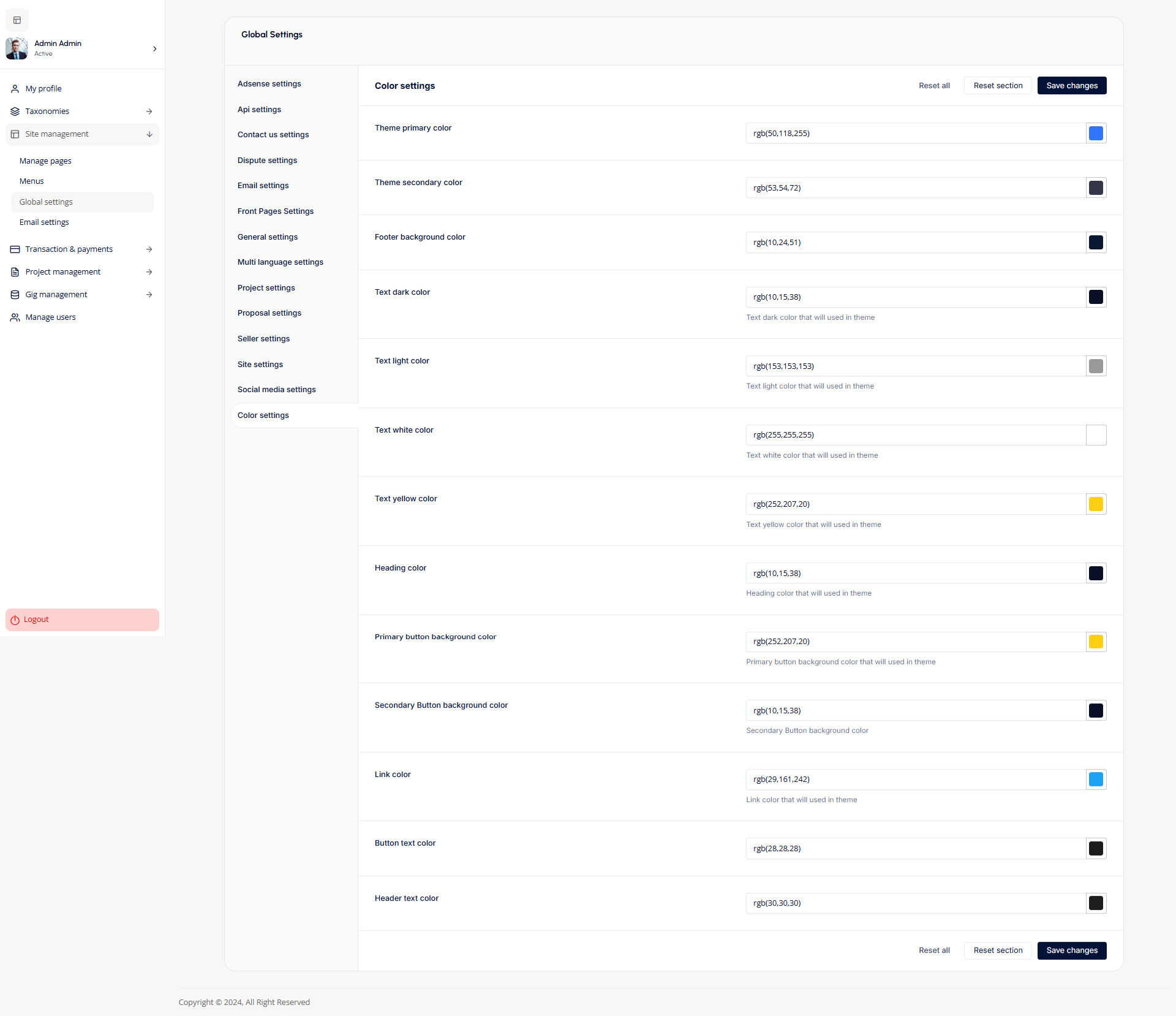 - Color Settings: The Color settings section allows admins to customize the platform's color scheme, including primary and secondary theme colors, text colors, button background colors, link colors, and header text colors. These options ensure a cohesive and visually appealing design that aligns with the platform's branding.
