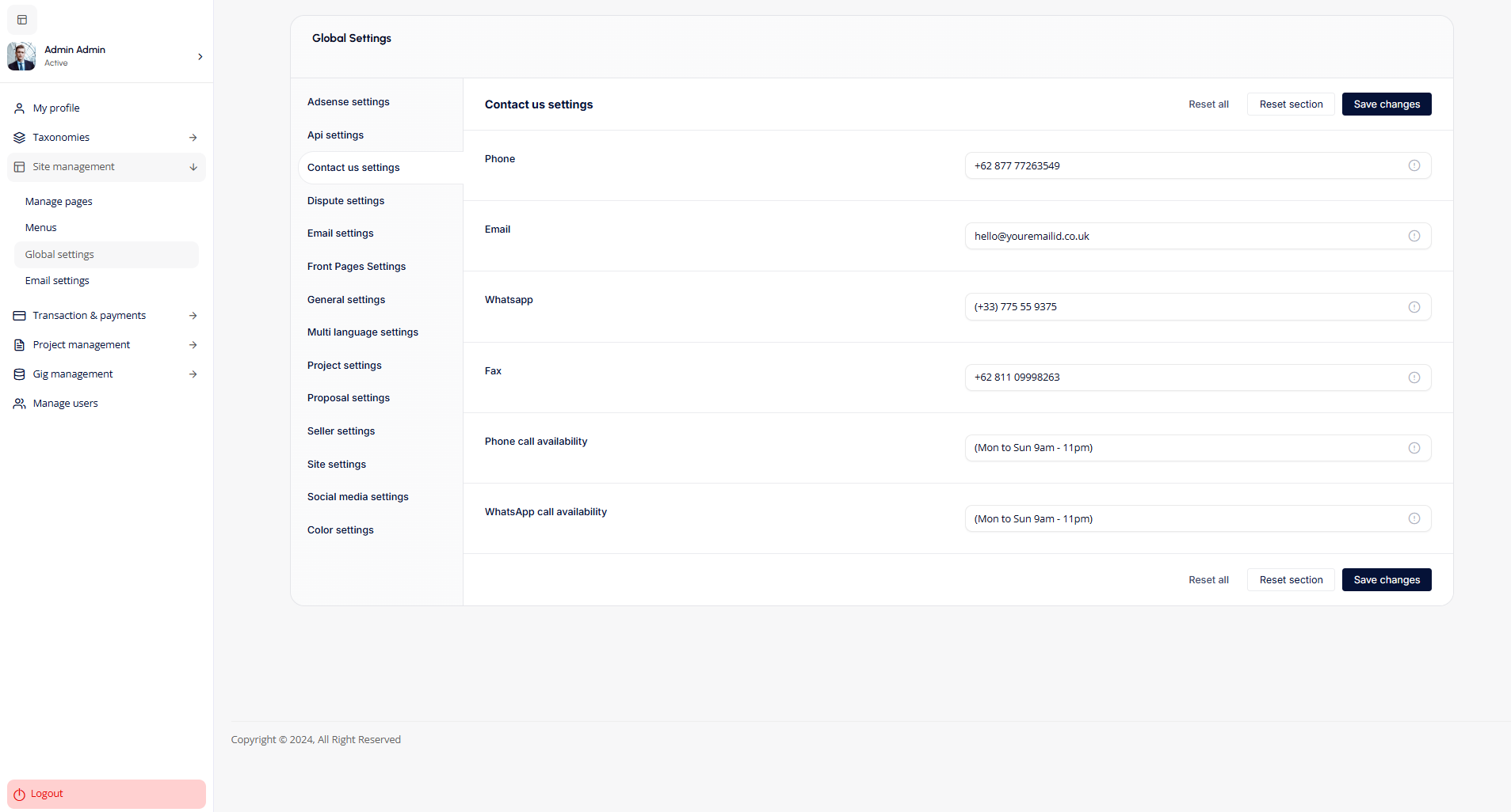 - Contact Us Settings: Configure Contact Us settings allow admins to configure support channels, including phone, email, WhatsApp, and fax, along with their availability schedules. It ensures clear and accessible communication for users during specified hours.
