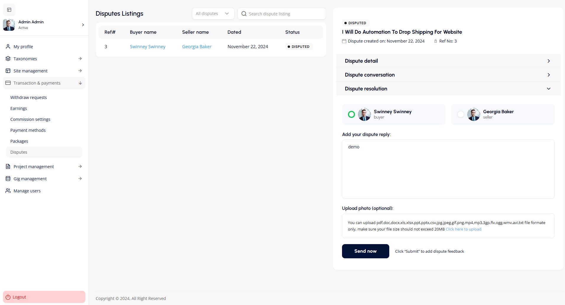 The Dispute Listings screen allows administrators to manage buyer-seller disputes effectively. It features a table displaying dispute details like reference number, buyer/seller names, date, and status. A detailed panel provides tabs for viewing dispute details, conversations, and resolutions. Admins can reply, upload supporting documents (up to 20MB), and resolve disputes by toggling between buyer and seller interactions. Filtering and search options make navigation simple, while the side menu offers access to related transaction, project, and user management tools. The interface is streamlined for efficient dispute resolution.