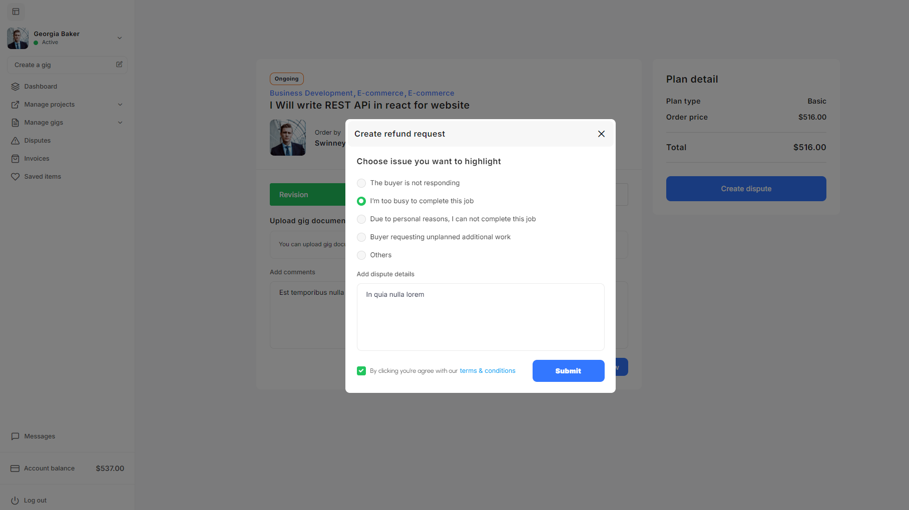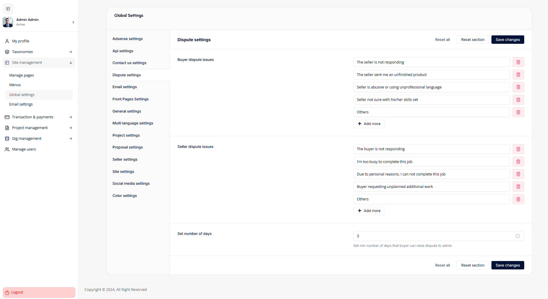 - Dispute Settings: Configure Dispute settings allow admins to define common dispute issues for buyers and sellers, such as lack of response or incomplete work, and set the minimum number of days for raising disputes. This ensures streamlined resolution processes for platform conflicts.
