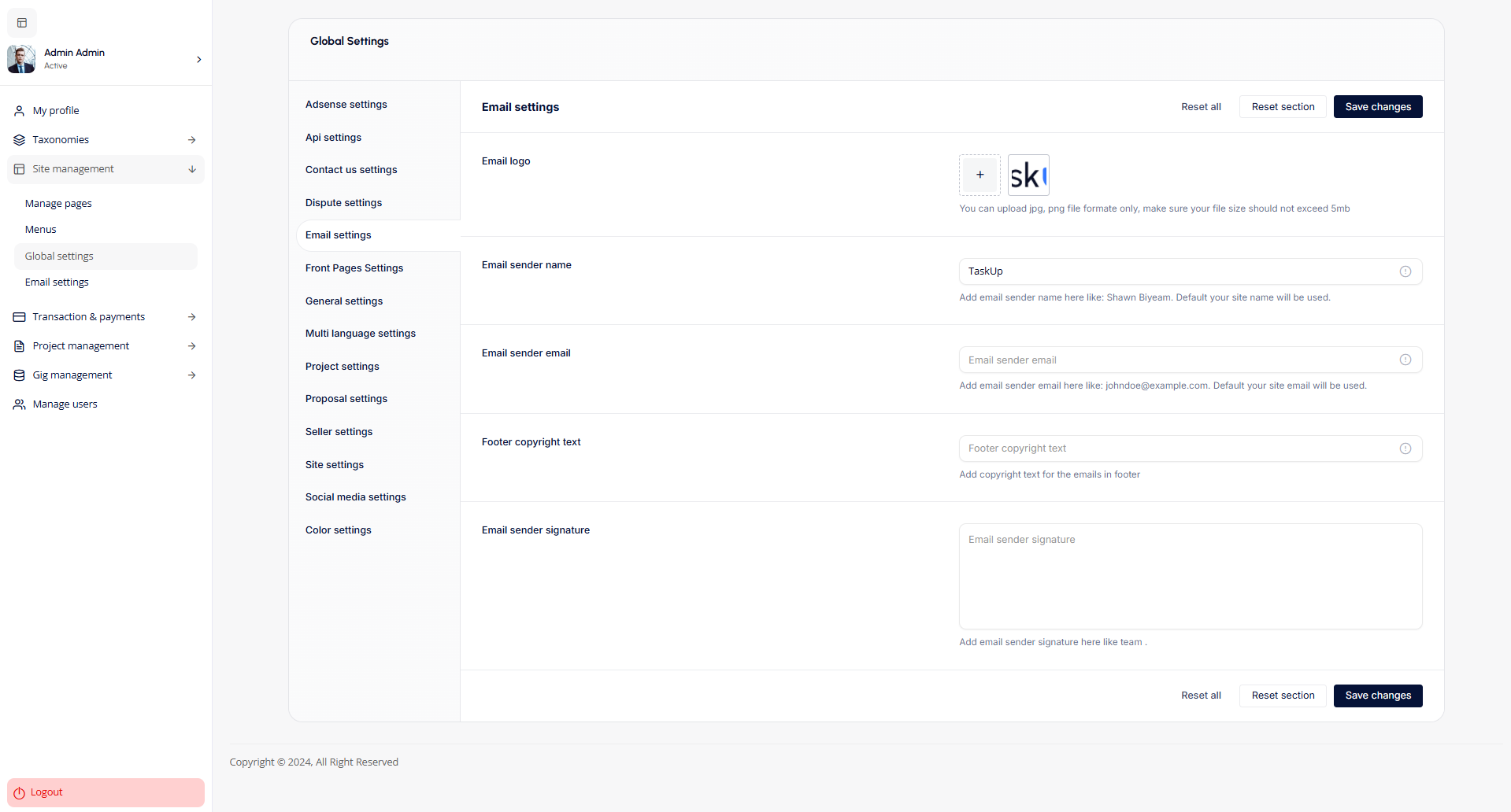- Email Settings: Configure the email logo, sender name, email, and signature, as well as footer copyright text.