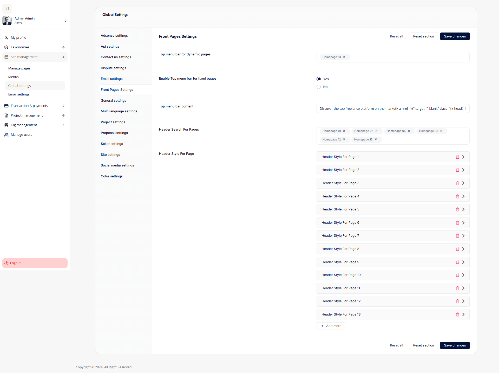 - Front Page Settings: Configure Front Pages settings allow admins to configure the top menu bar for dynamic and fixed pages, manage header content, and set custom header styles for individual pages. This provides flexibility in designing and customizing the website's user interface.