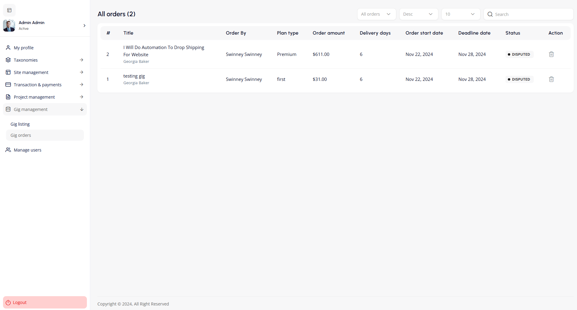 The All Orders screen provides a summary of gig orders, displaying details like gig title, buyer, plan type, order amount, delivery days, start and deadline dates, and status (e.g., DISPUTED). Admins can filter, search, and delete orders using available tools for efficient management.
