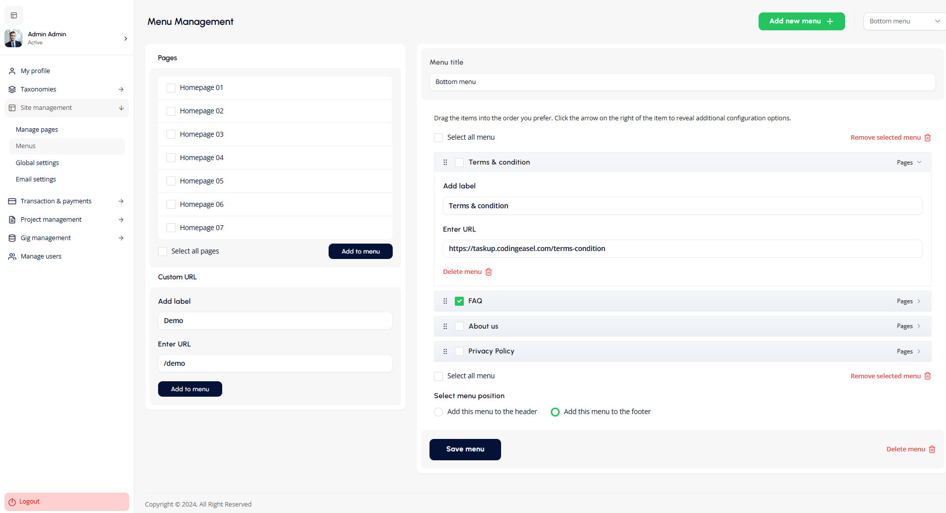 - Add New Menu: Click on the "Add new menu" button, enter the menu title, and select the position (Header or Footer).