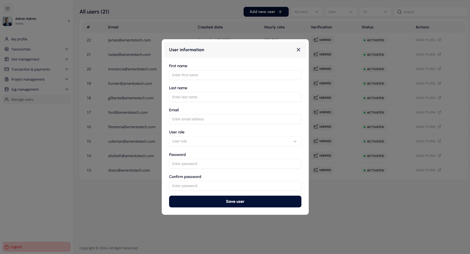 Admins can add new users by entering details in the User Information Modal: