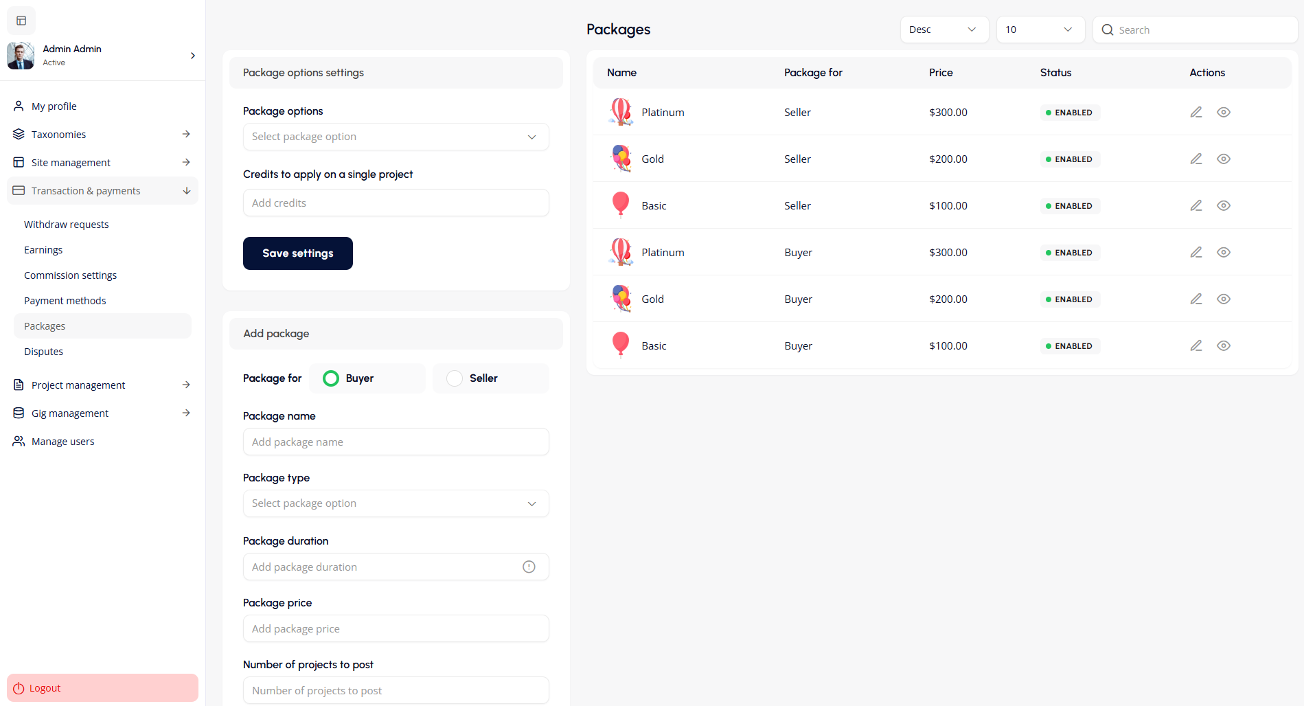 Admins can create new packages for either Buyers or Sellers by configuring the following: