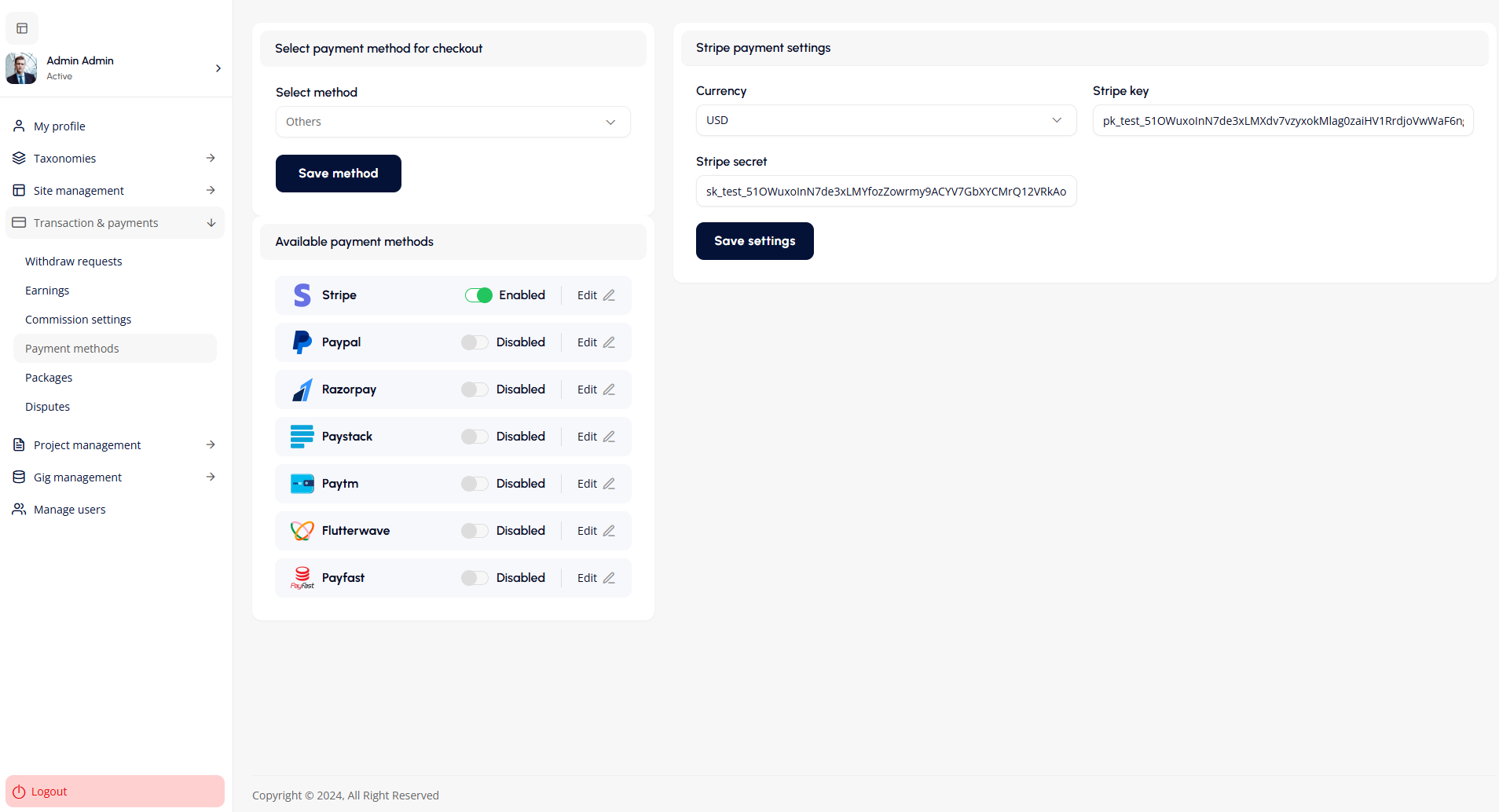 - Manage Available Payment Methods: Enable, disable, or edit payment methods such as Stripe, PayPal, Razorpay, Paystack, Paytm, Flutterwave, and Payfast.