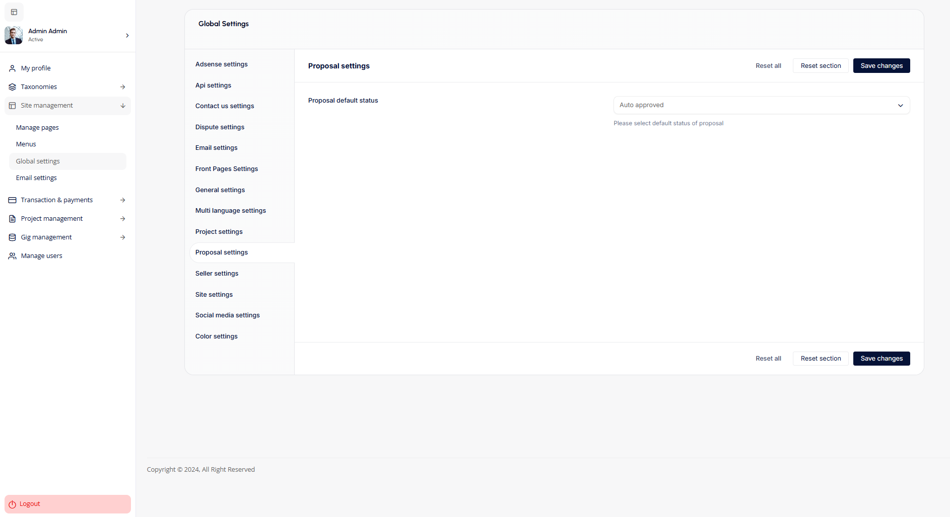 - Proposal Settings: The Proposal settings allow admins to set the default status of proposals, such as auto-approved or pending, to streamline the proposal review process on the platform.