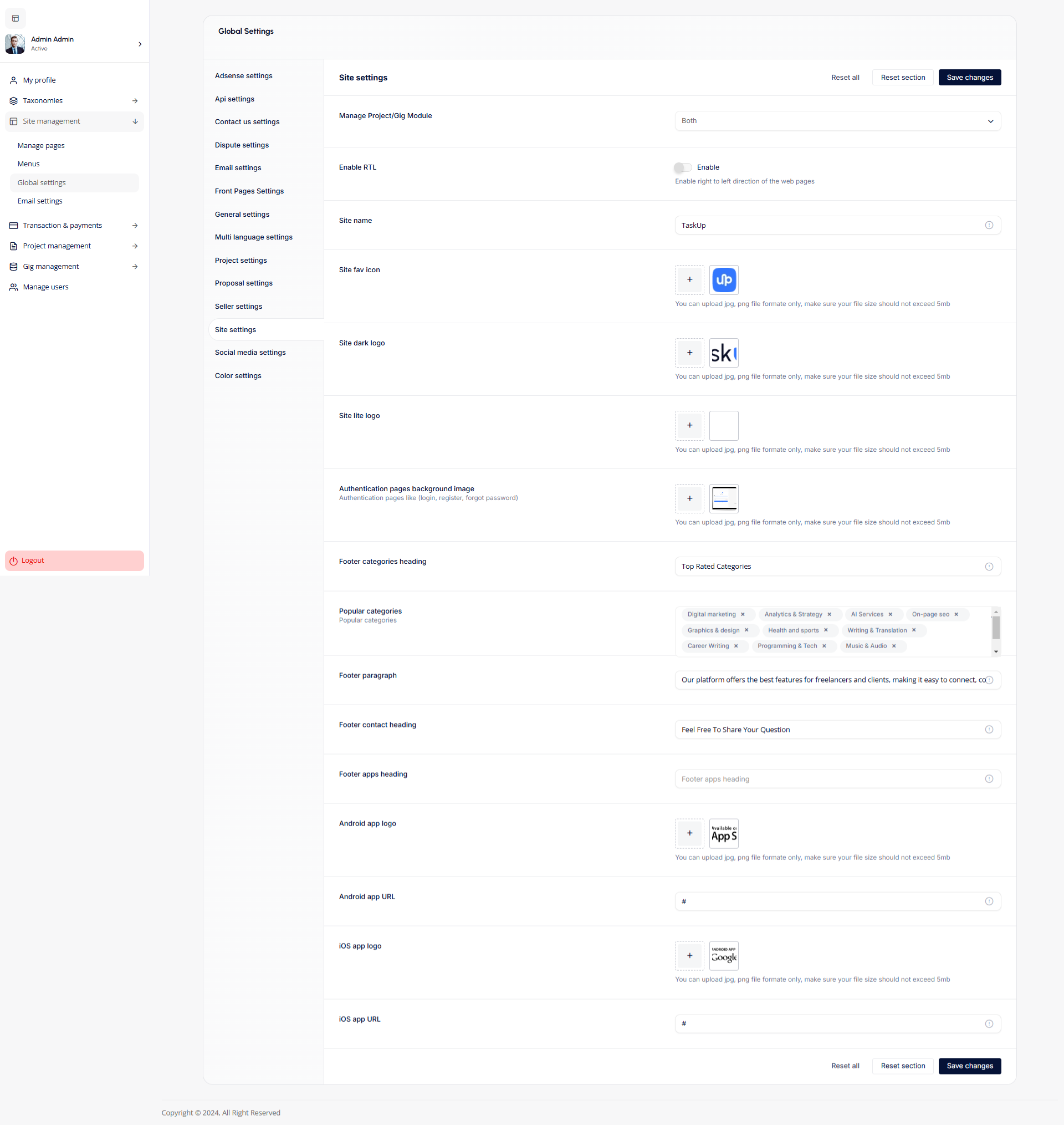- Site Settings: The Site settings section allows administrators to manage essential configurations for the platform, such as enabling RTL (Right-to-Left) layout, customizing logos, site name, and site icons. It also includes options for setting authentication page backgrounds, footer headings and content, popular categories, and app logos/URLs for mobile platforms. These settings enhance the platform's branding and user experience.