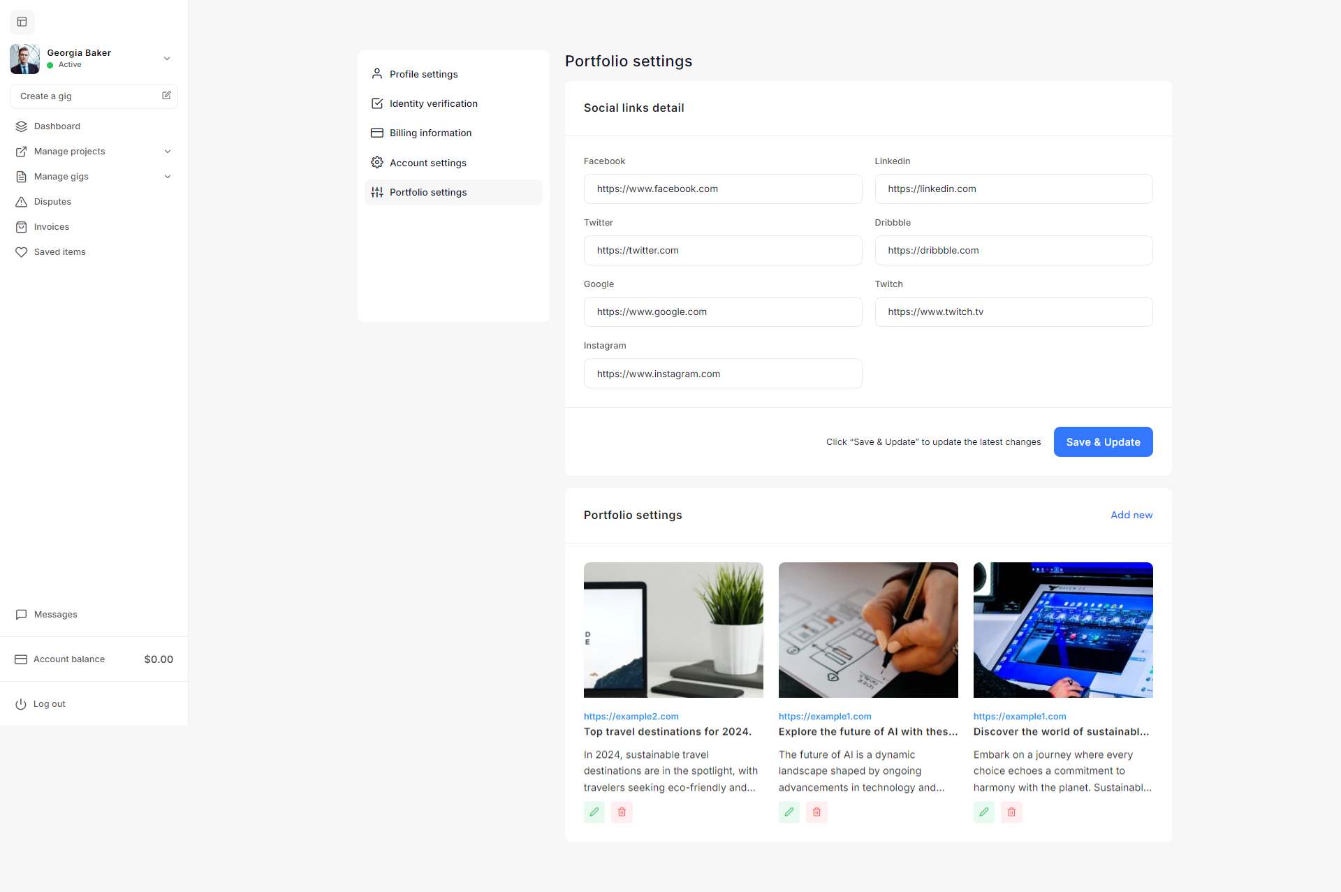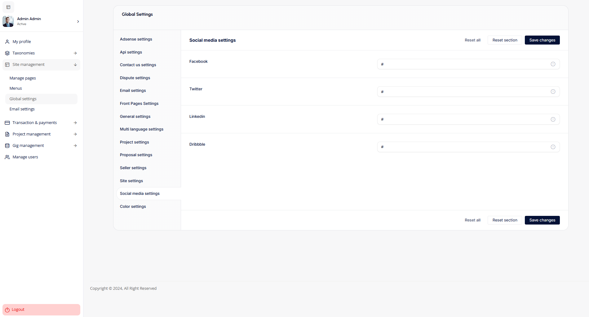 - Social Media Settings: The Social Media settings allow admins to link the platform to various social media profiles, such as Facebook, Twitter, LinkedIn, and Dribbble. These settings enhance connectivity and provide users with easy access to the platform's social media presence.