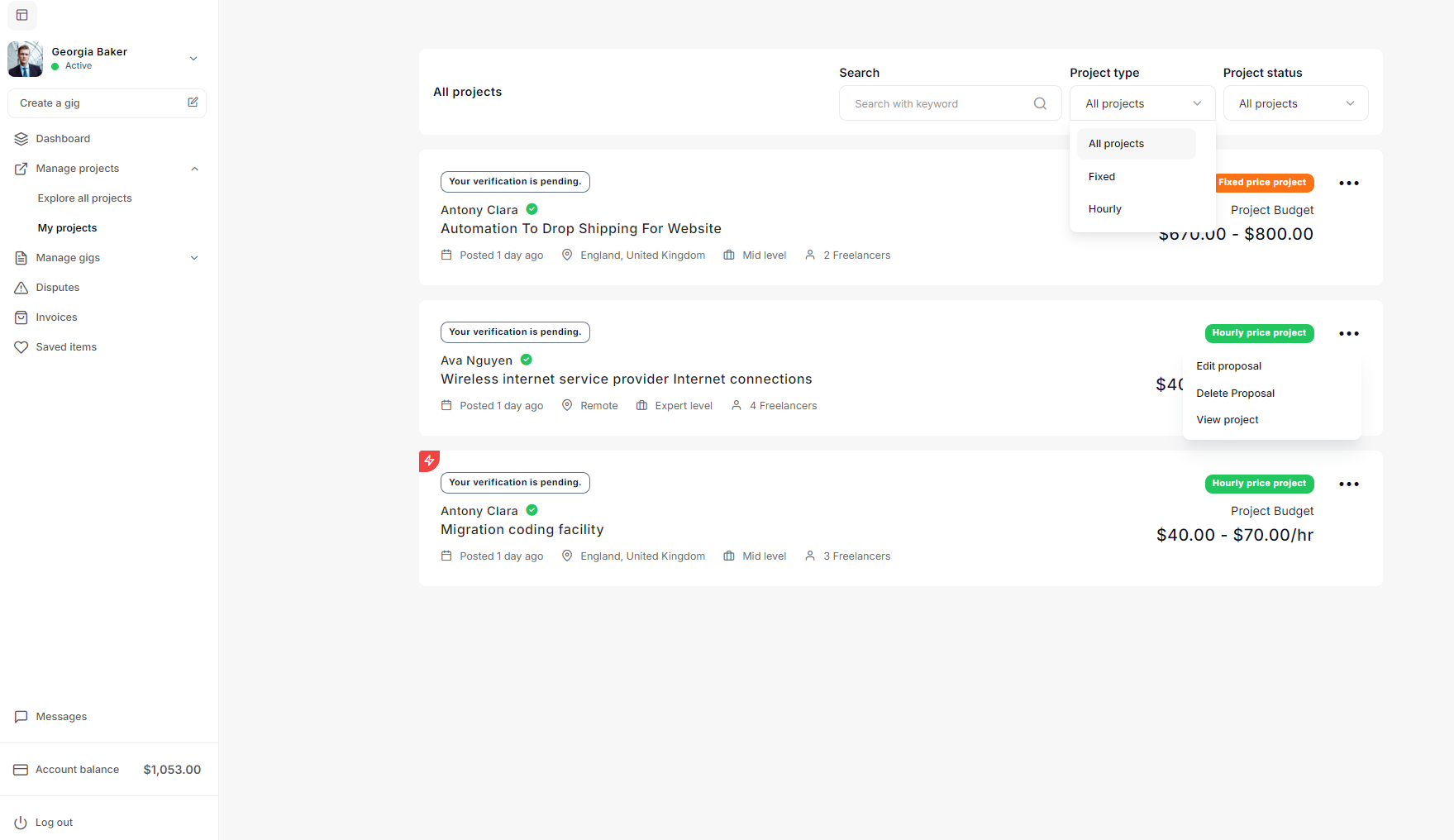 The All Projects screen provides an organized overview of projects, displaying details like project title, author, budget, type (hourly/fixed), status, and creation date. Admins can view, approve, or delete projects using action icons. Filtering, sorting, and search options enable quick navigation, while pagination helps manage large project lists. The sidebar offers access to related tools, including proposal and gig management.