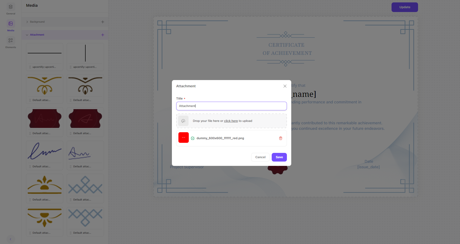 - In the Attachment feature allows users to add visual or decorative elements, such as signatures, logos, or custom graphics, to documents like certificates.