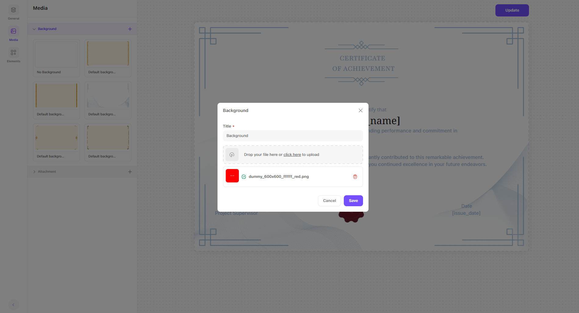The Media section in Lernen’s editor provides users with the tools to manage and upload media elements such as backgrounds and attachments for their documents and certificates. Here's how to use it effectively: