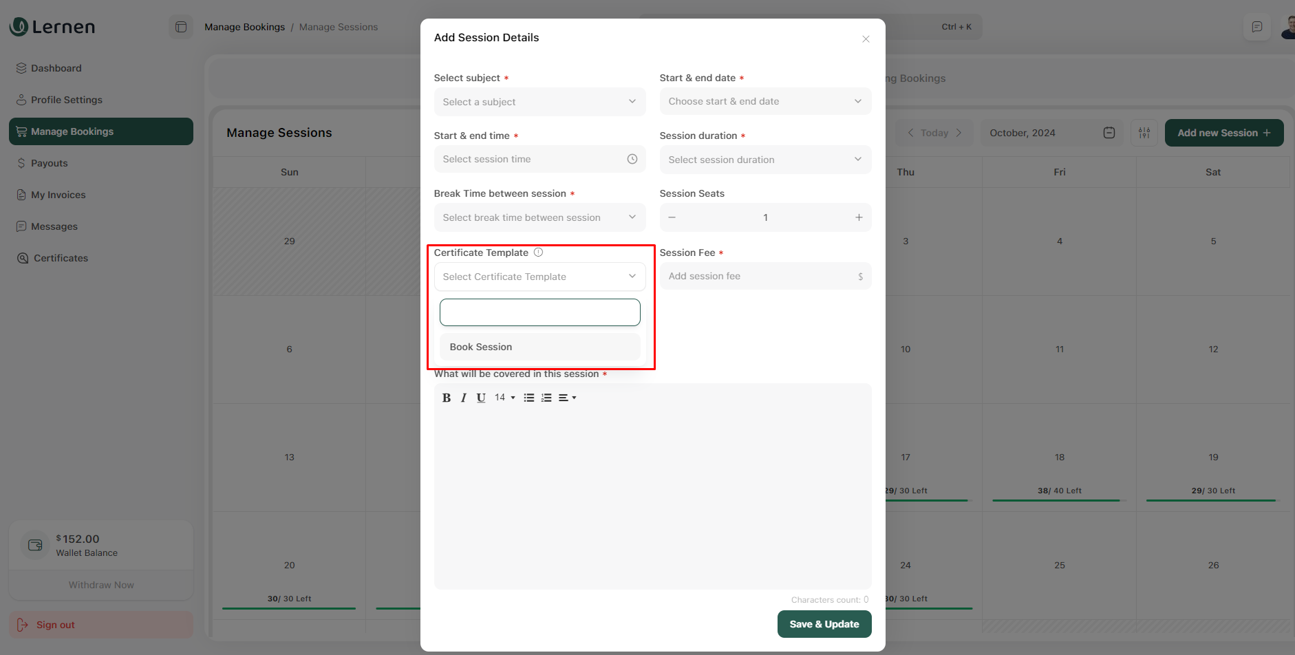 Note: If no certificate is selected, students will not receive a certificate upon completion of the session.