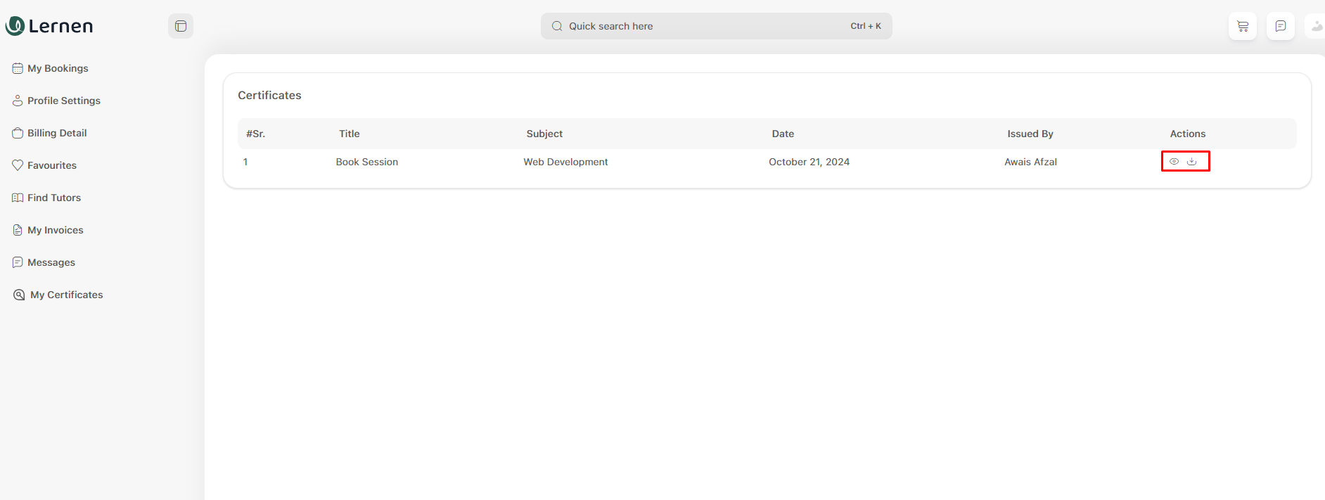 When booking is completed, the student will receive a certificate. The Download Certificate page allows students to download their certificates. Here's how to use it: