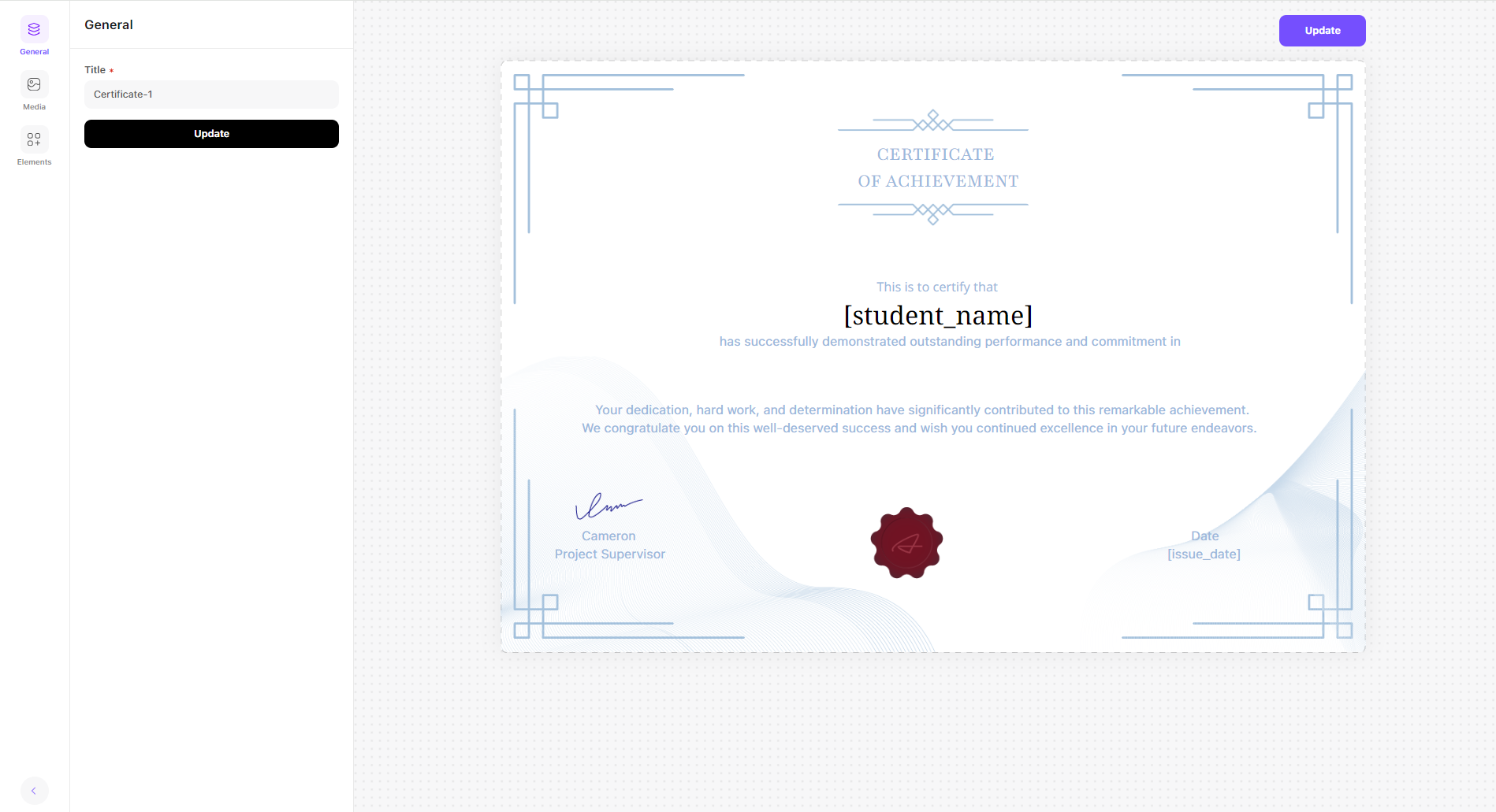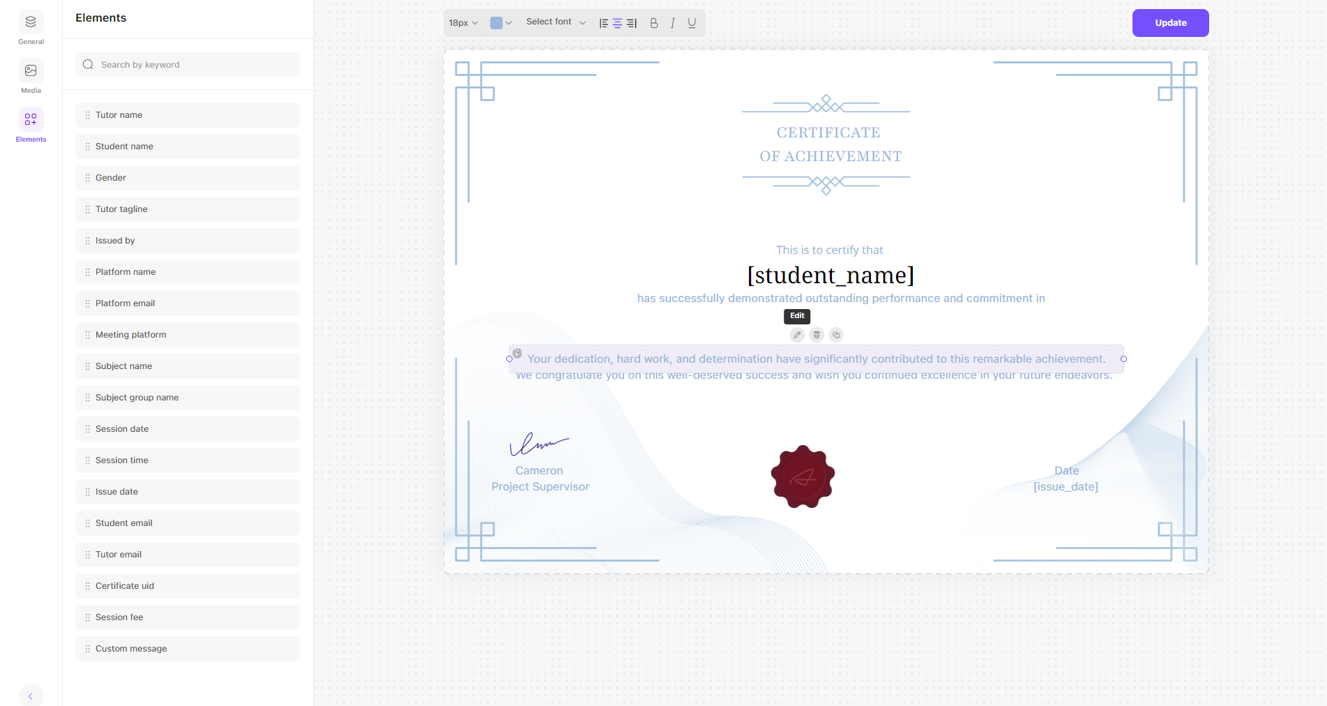 - Drag and drop an element onto the document canvas. The placeholder text (e.g., [tutor_name]) will appear where the data will be automatically filled when the certificate is generated.