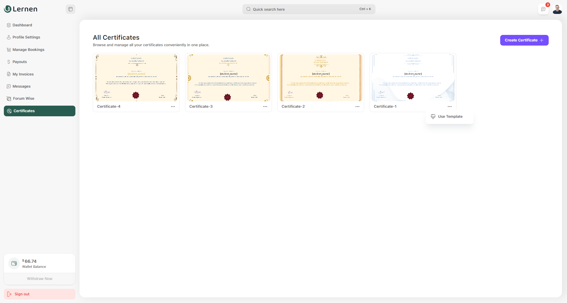 - Located at the top right of the page, the Create Certificate button allows users to add a new certificate.