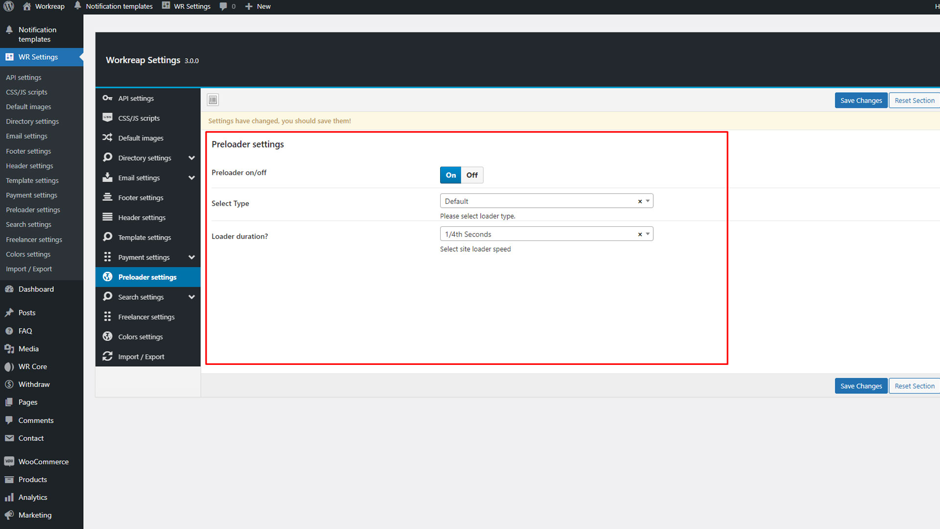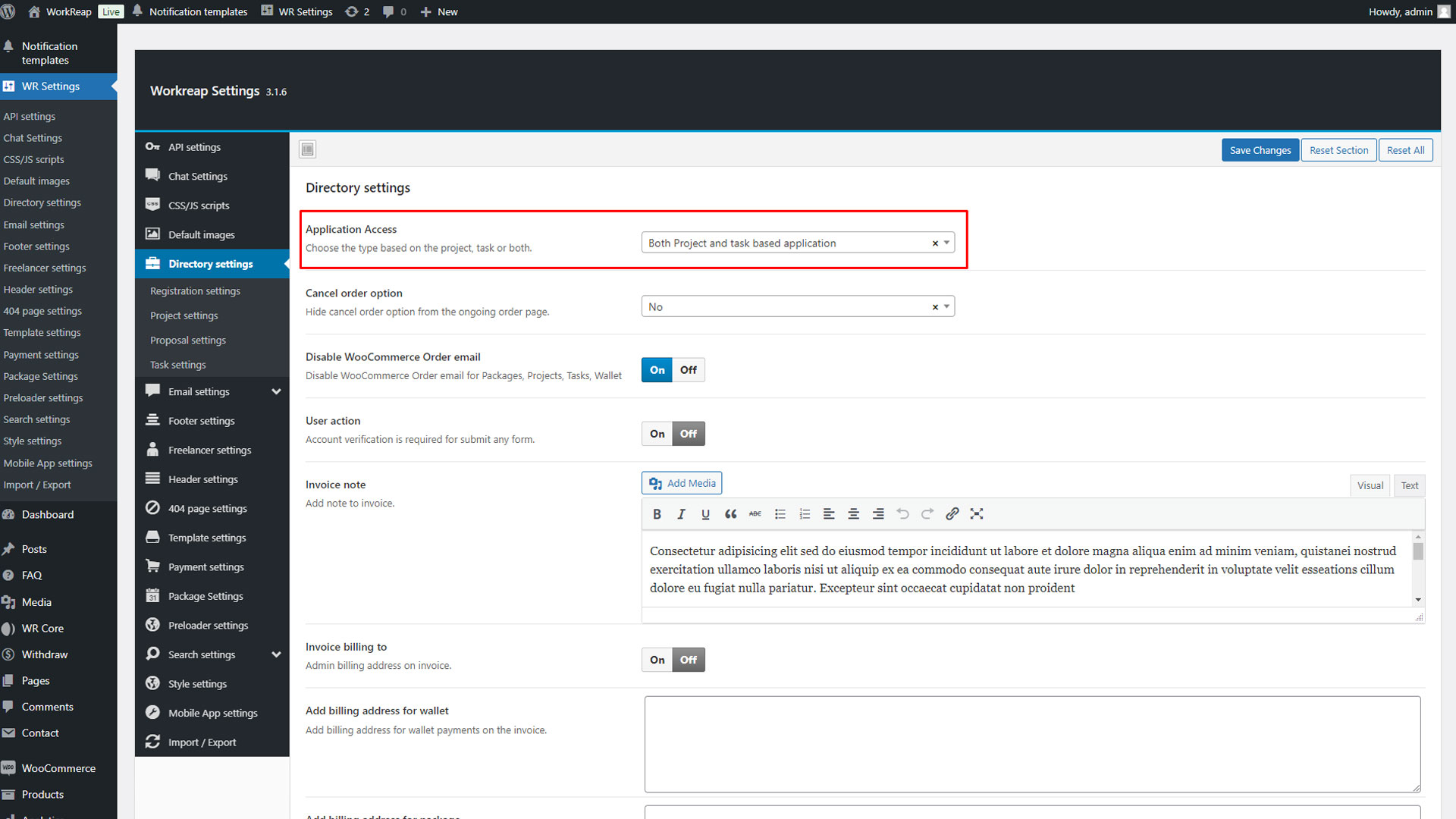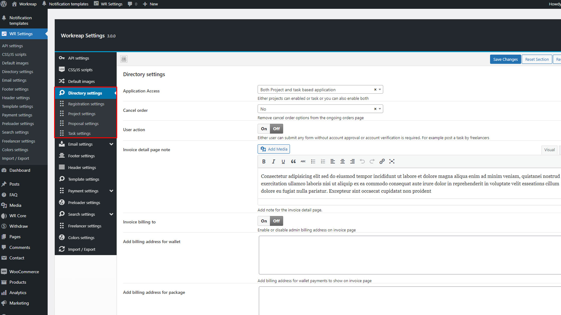 After installing and activating the Workreap required plugins, go to WP Admin > WooCommerce > Settings > Advanced > Features, and set the order data storage to "WordPress post storage".