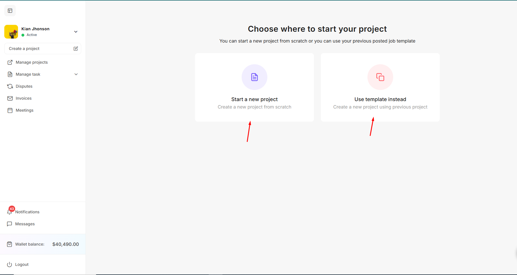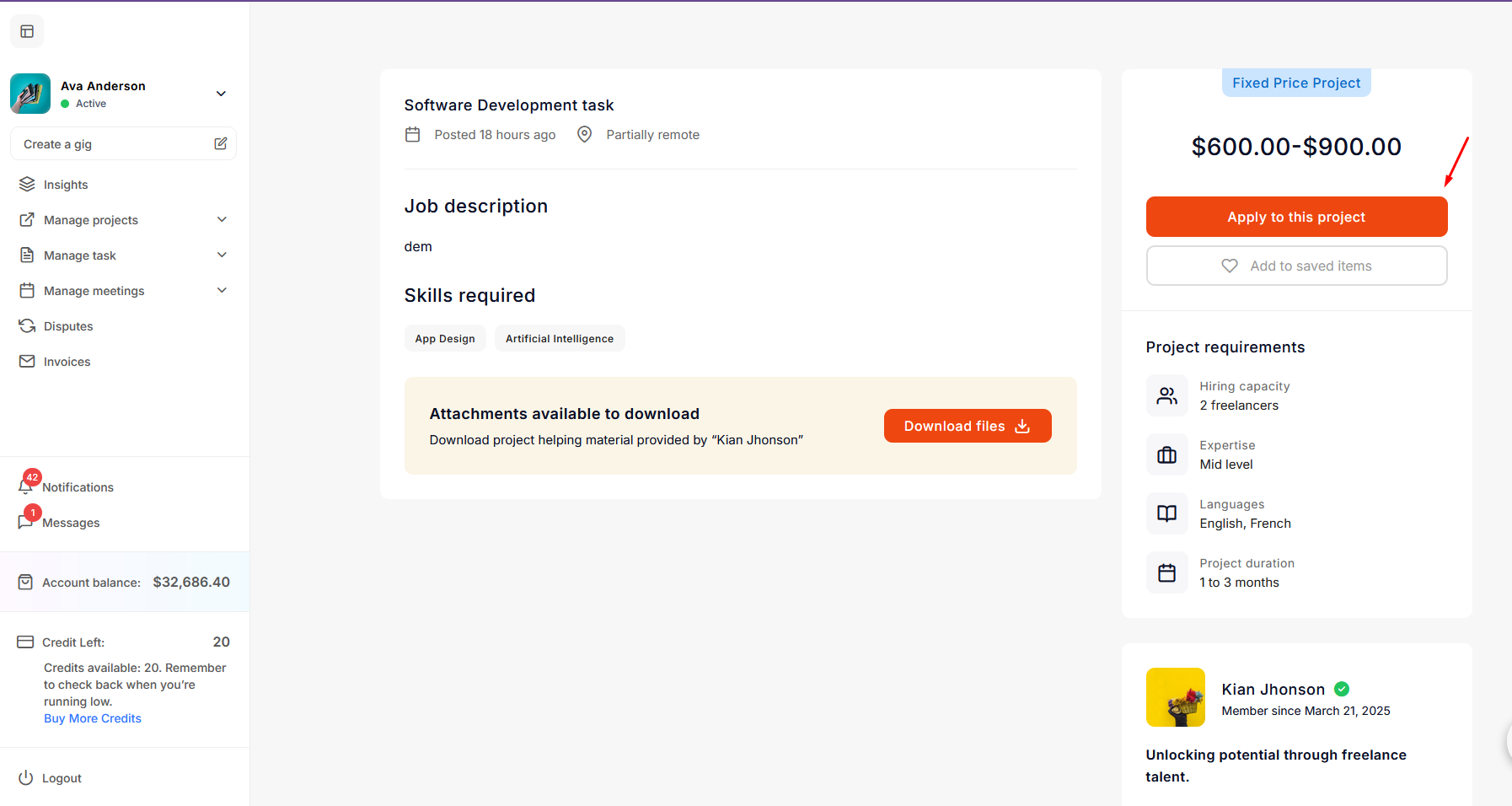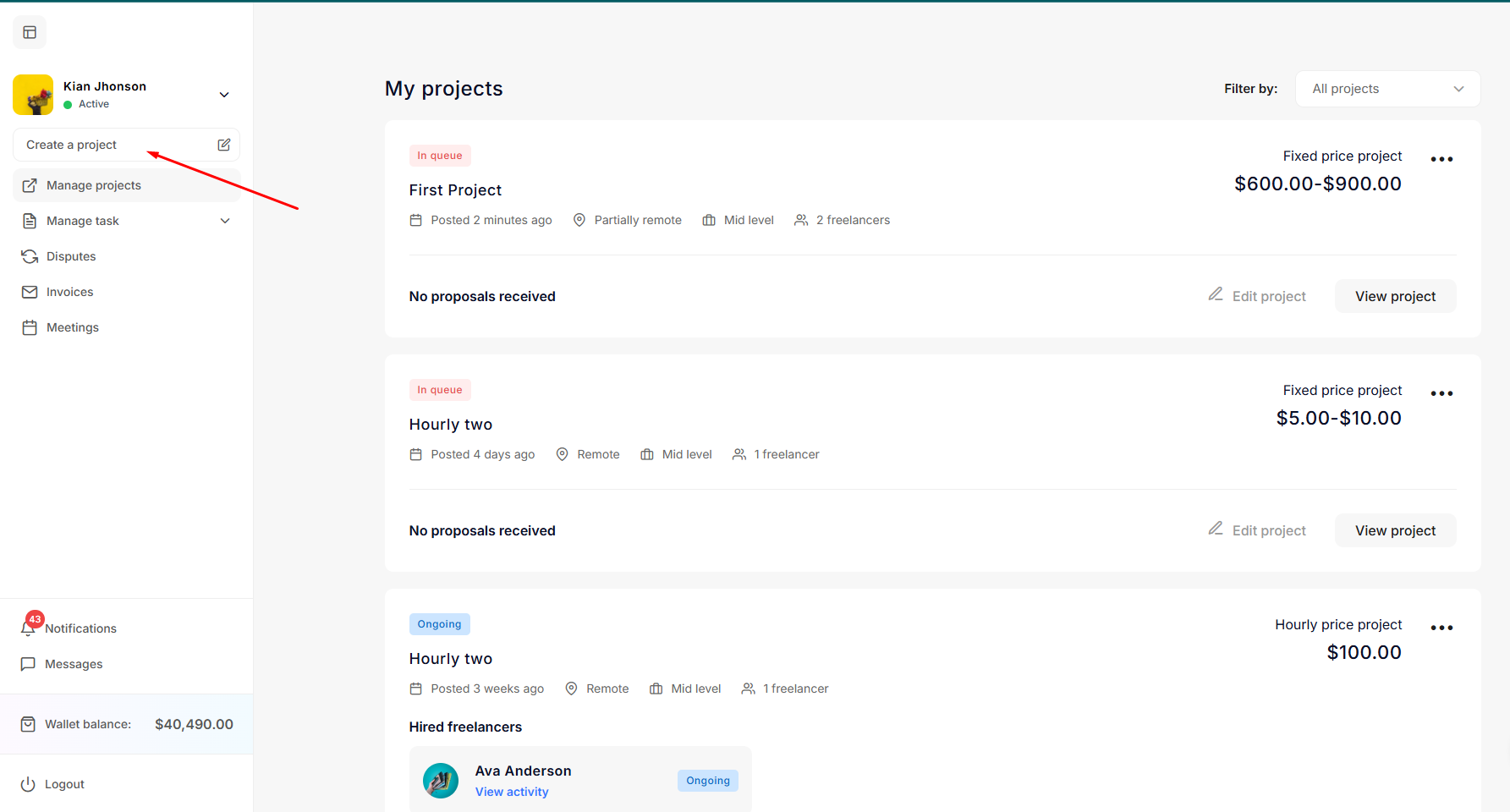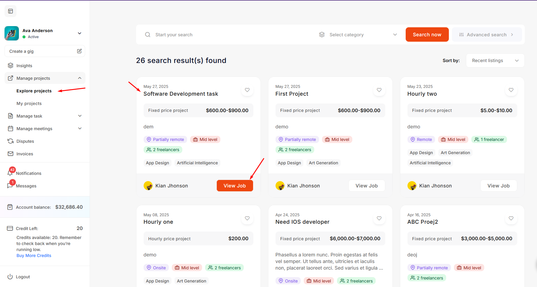 After logging in as an freelancer, explore the