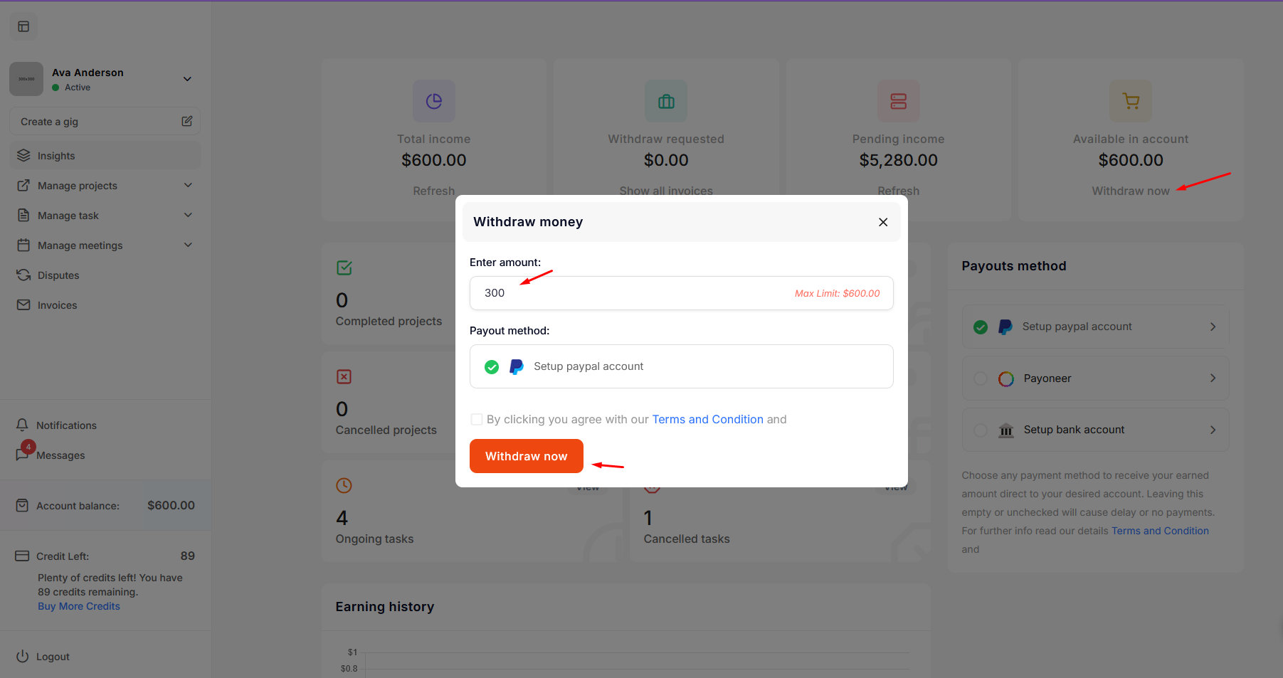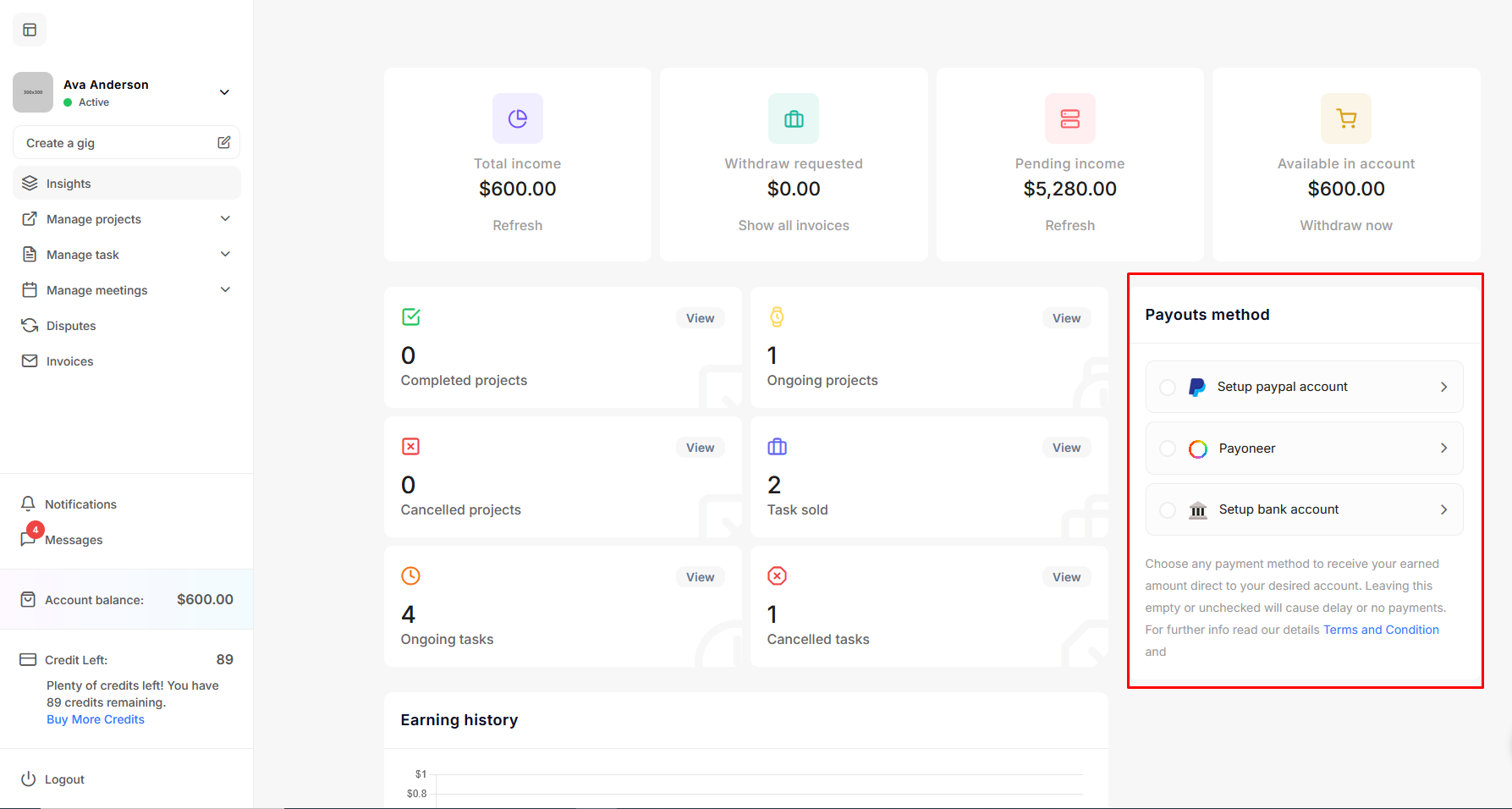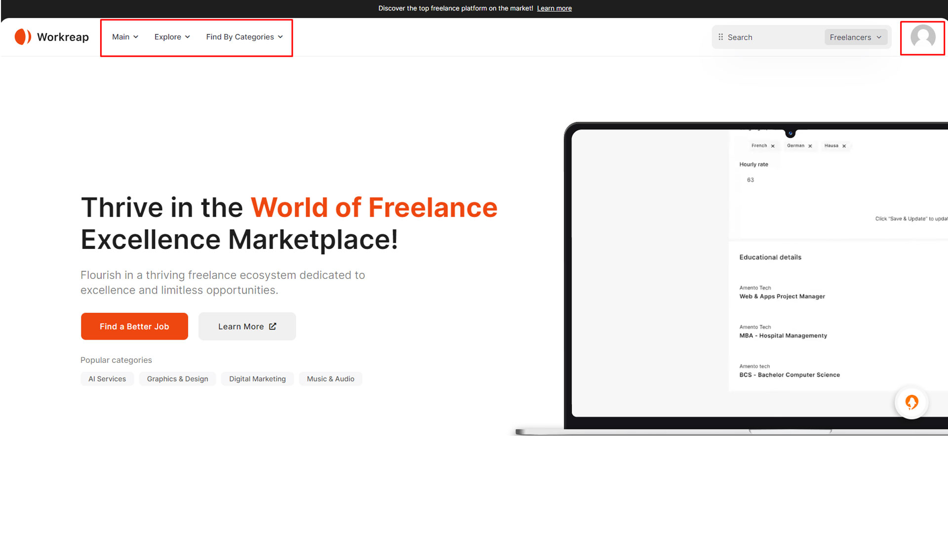 After logging in as an freelancer, explore the