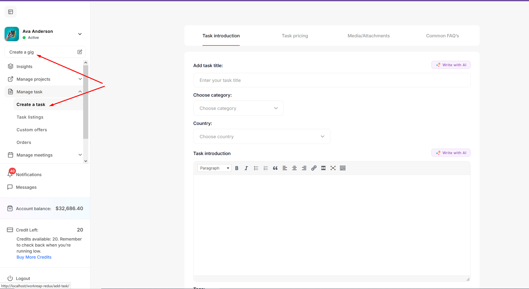The Freelancer can create a service by clicking on Create a Gig or by clicking on Manage Task -> Create a Task.