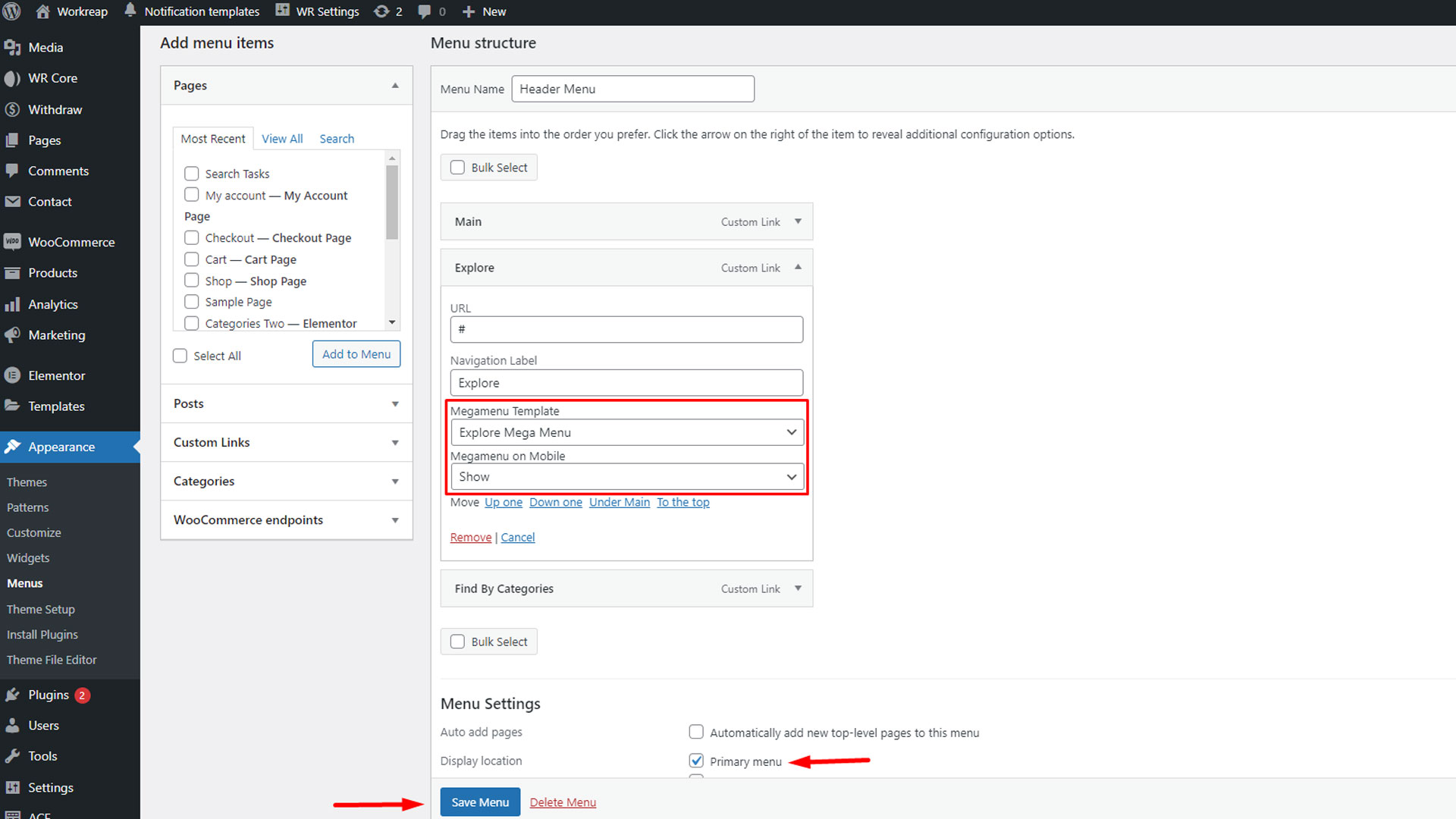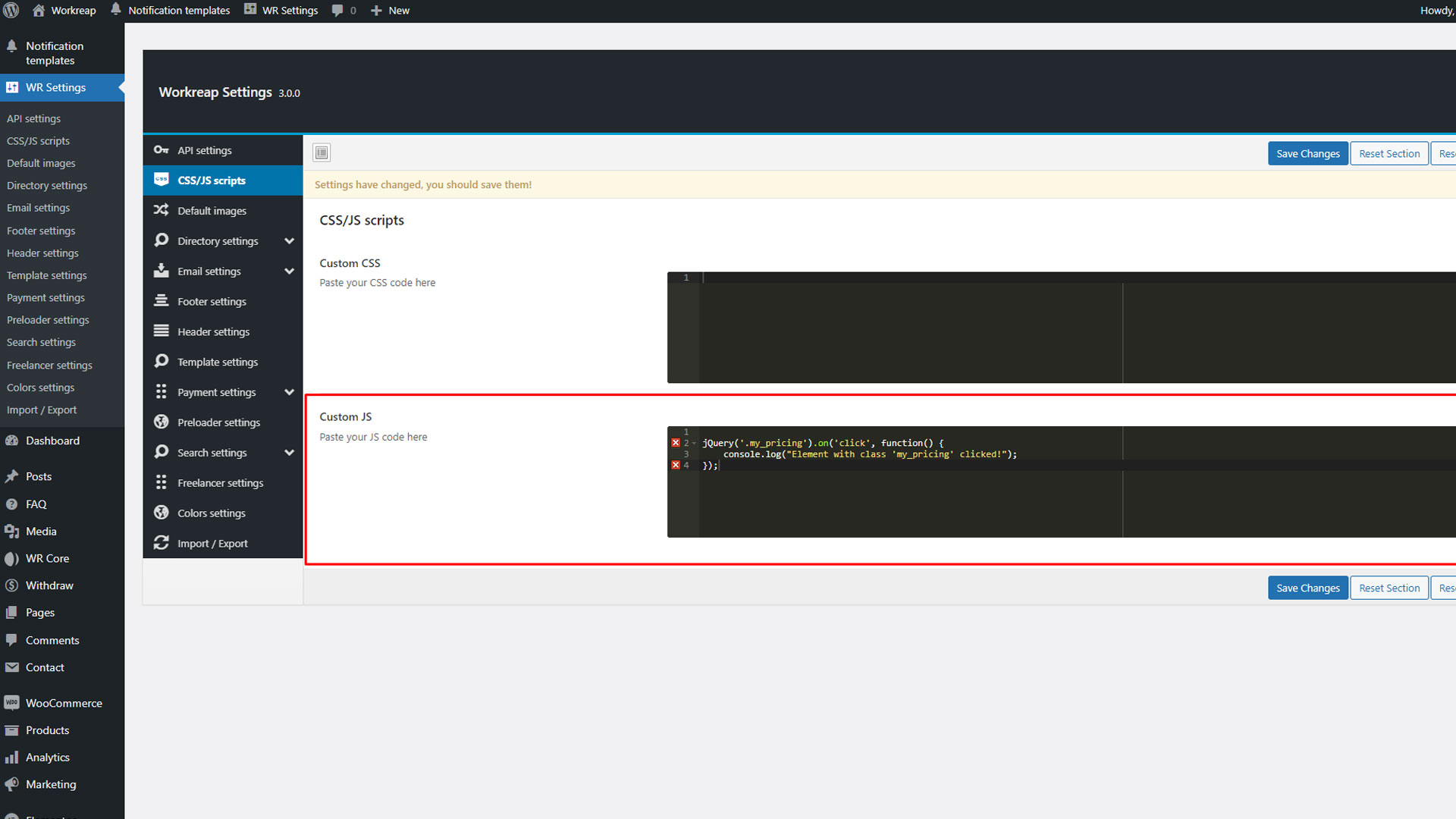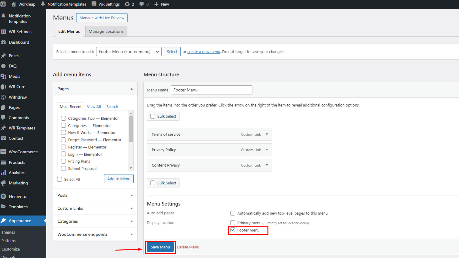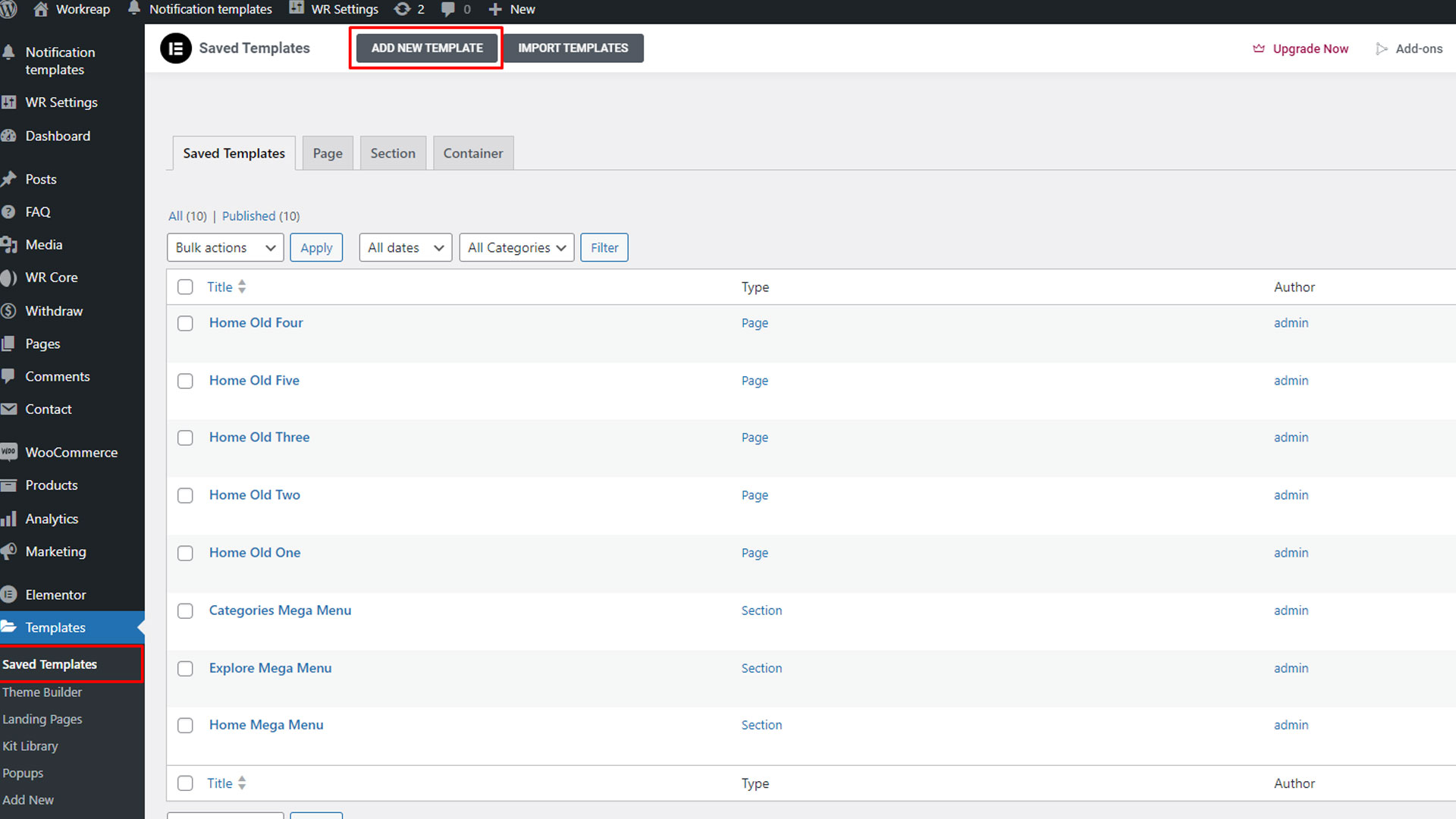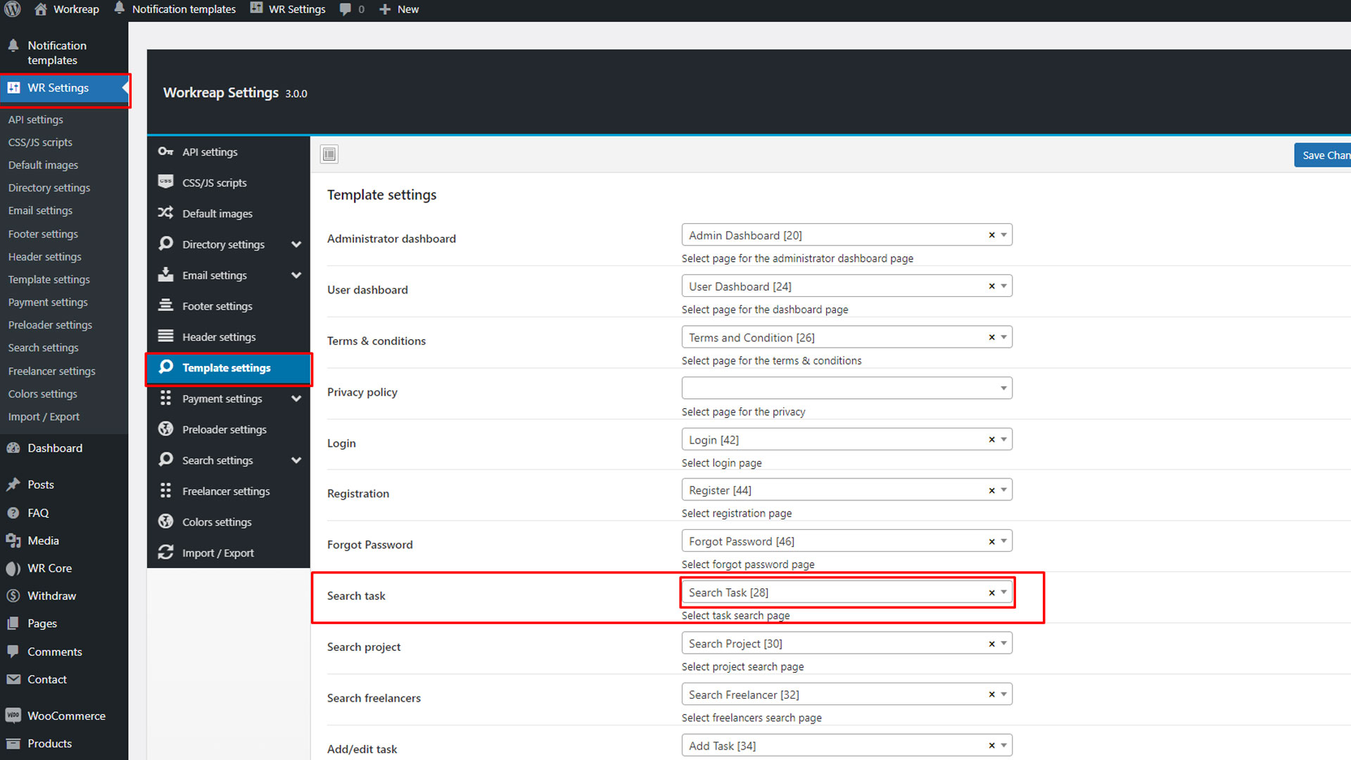 Step 3: After publishing each page, navigate to the WordPress admin dashboard. From there, go to WR Settings > Template and configure the template location accordingly and save changes.