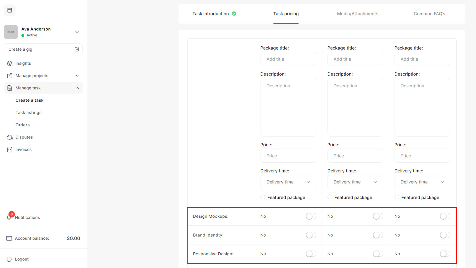 On the Task pricing screen Freelancer name his Packages that he offers. Here some extra ACF fields showing. These fields are related to categories that freelancer shoose in Task information under Task type and set by the Admin under ACF fields group.