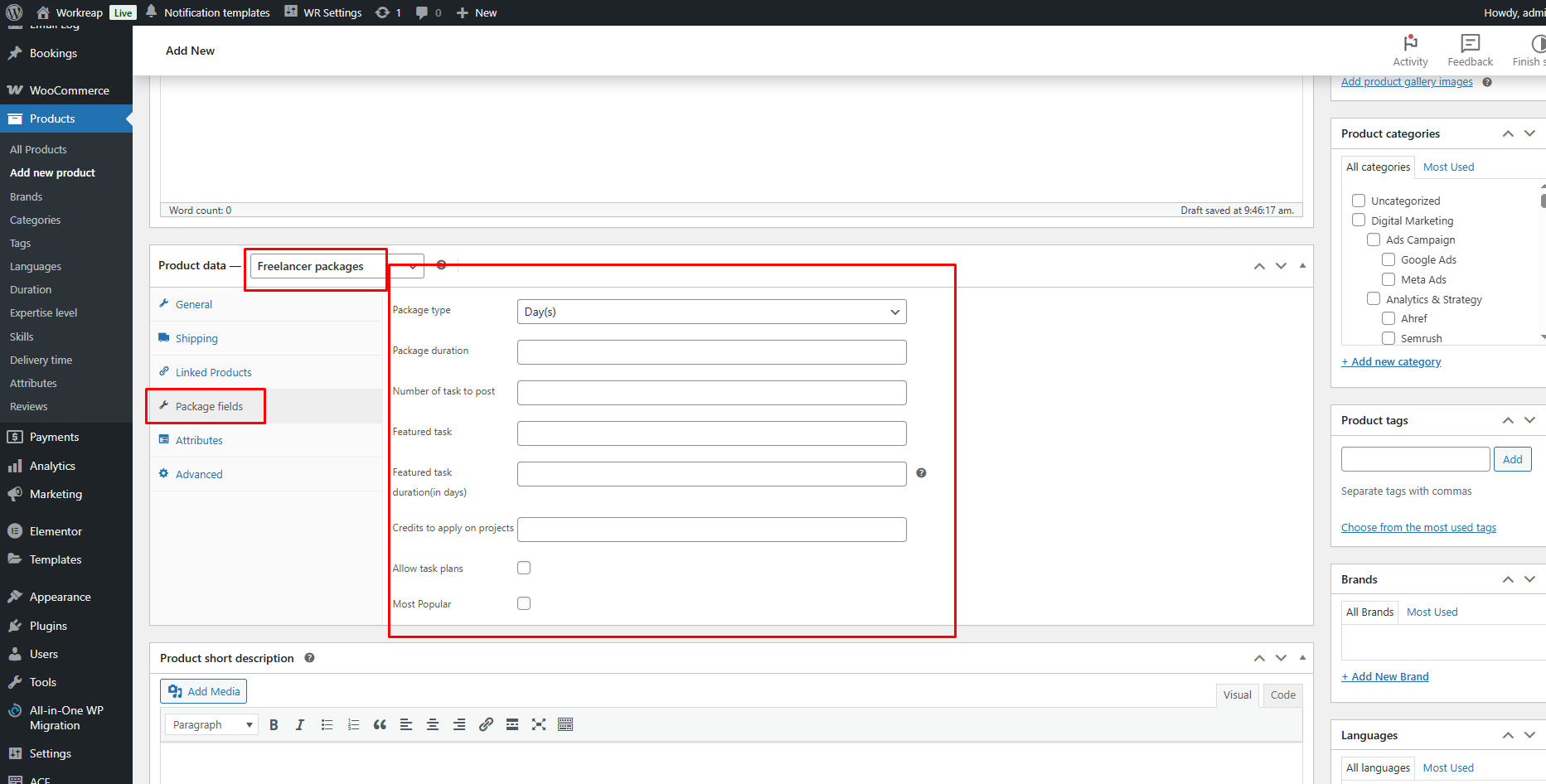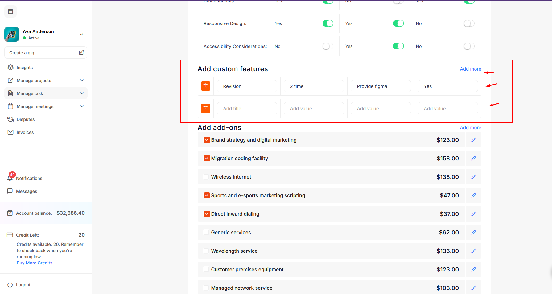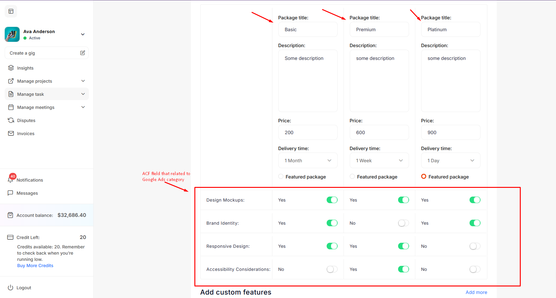 The freelancer can add more custom feature fields to provide extra information if the fields in the above packages do not fulfill their requirements.