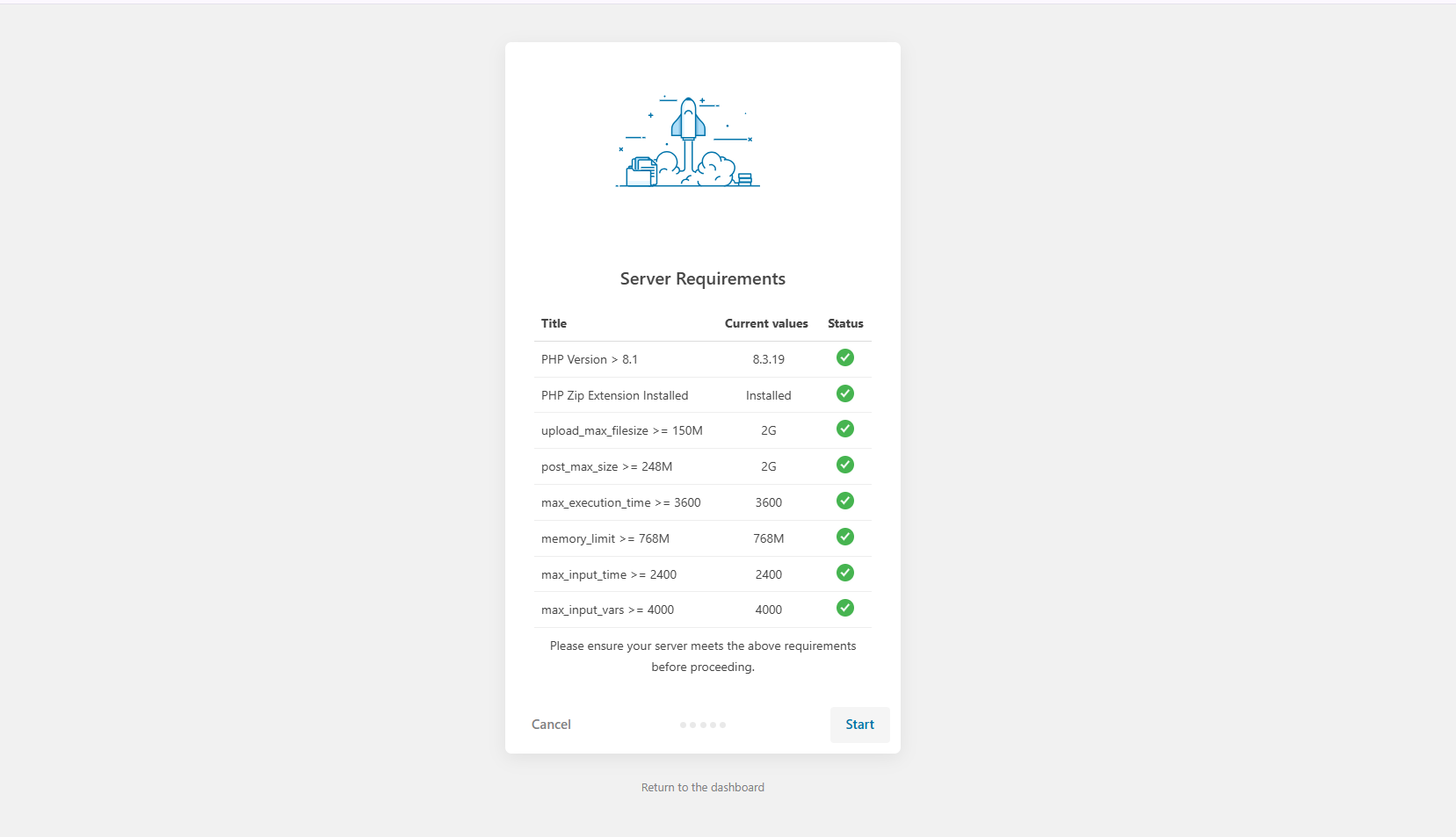 You can verify that your server meets the requirements for importing the demo content. If your server fulfills all the requirements, then the Start button will be displayed. Click on the Start button to proceed with the setup process.