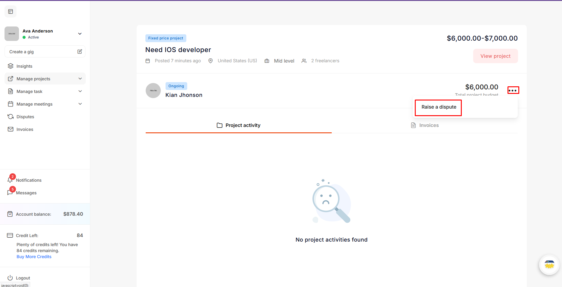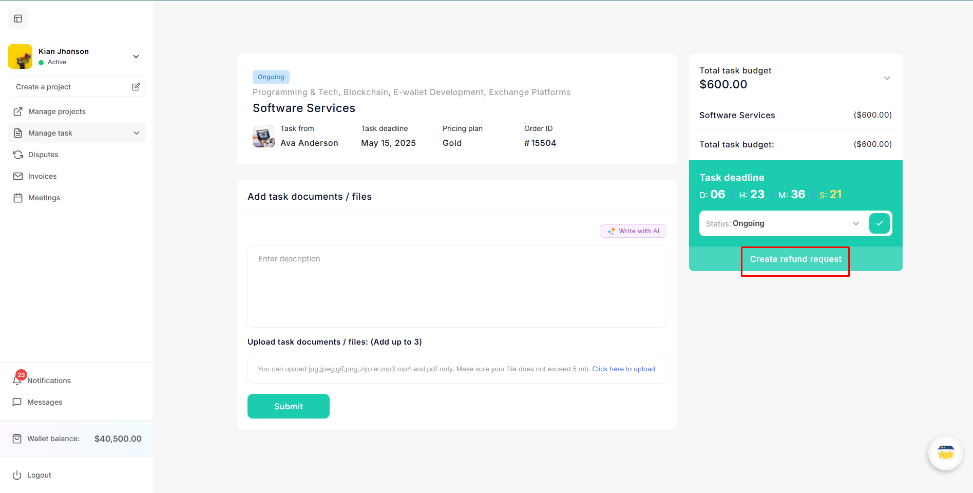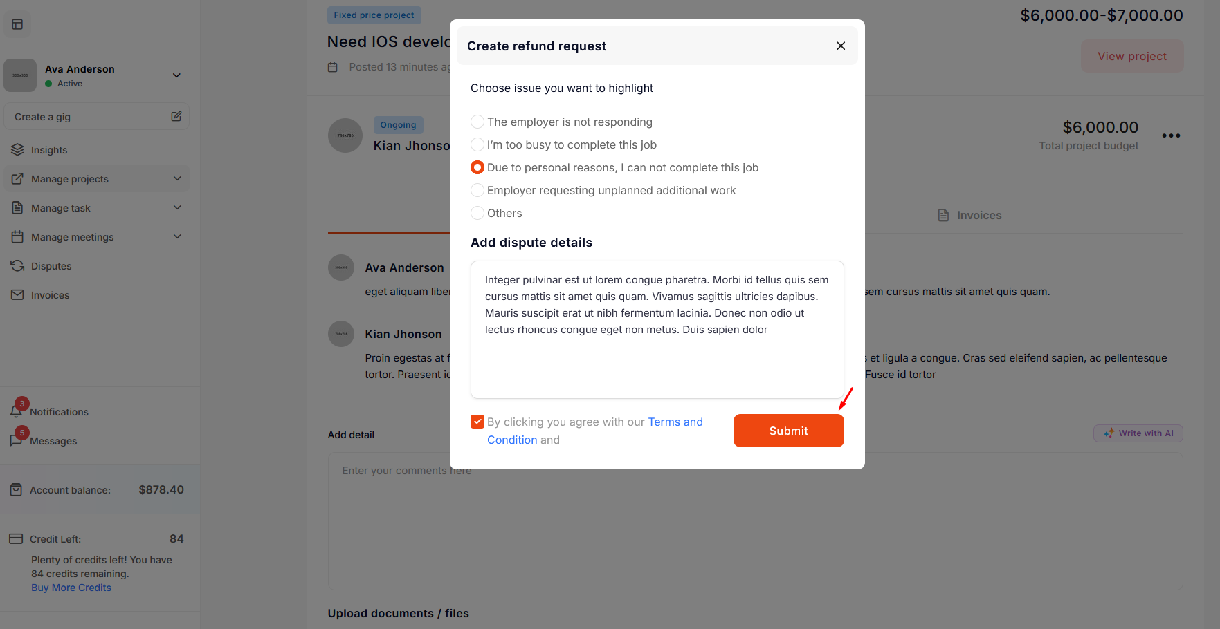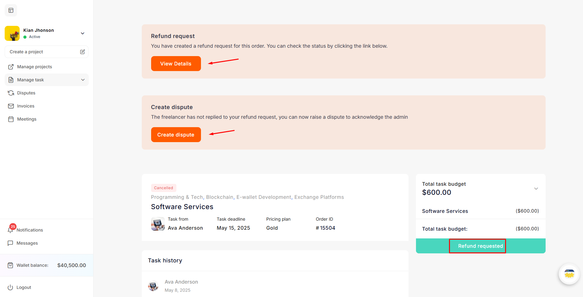 The freelancer clicks on Create Dispute and fills out the form to submit a refund request. After that, the project status changes from Ongoing to Disputed.