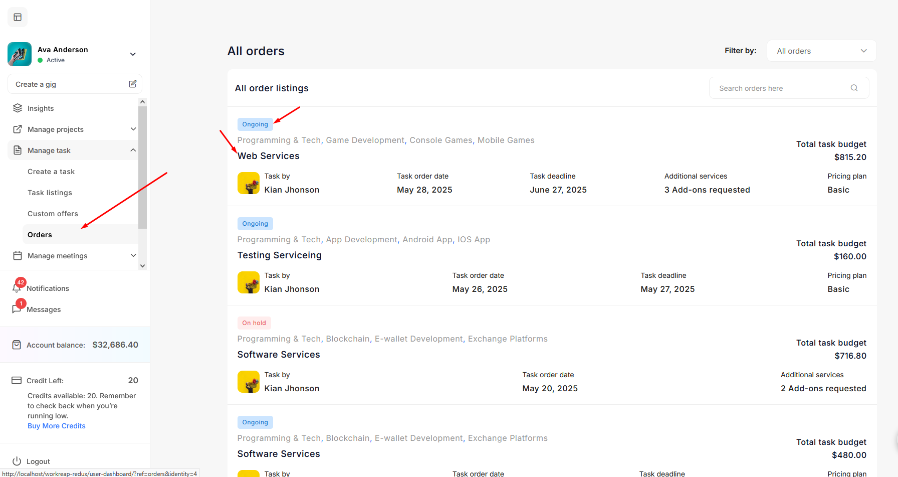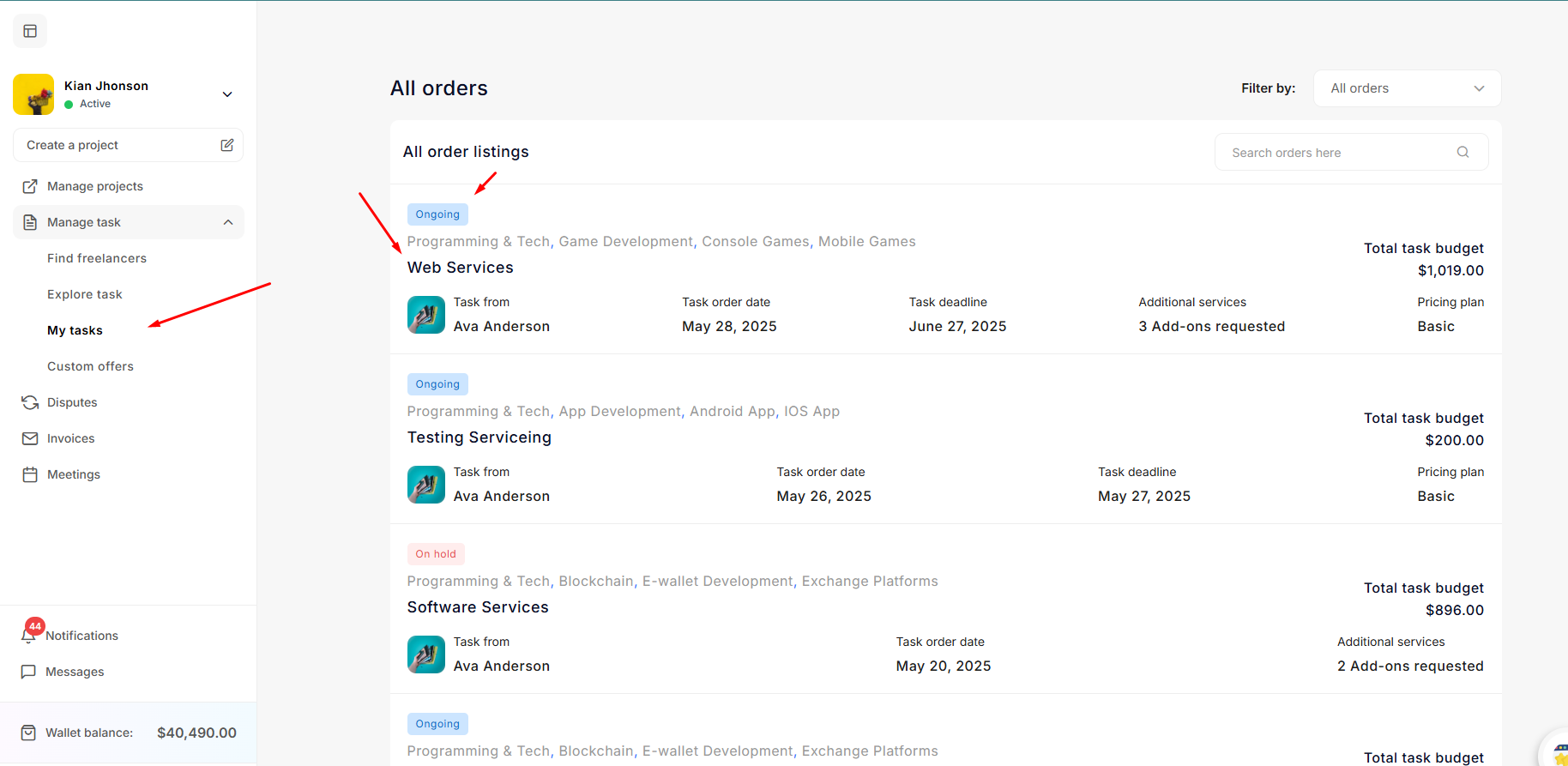 An Employer books a specific service of a Freelancer. After purchasing the service, the Employer can view it under Manage Tasks -> My Tasks on their dashboard. The freelancer can see it under Manage Tasks -> Orders on their dashboard.