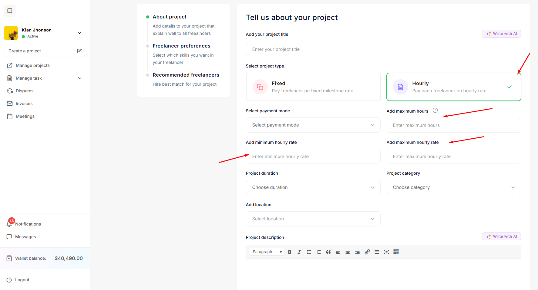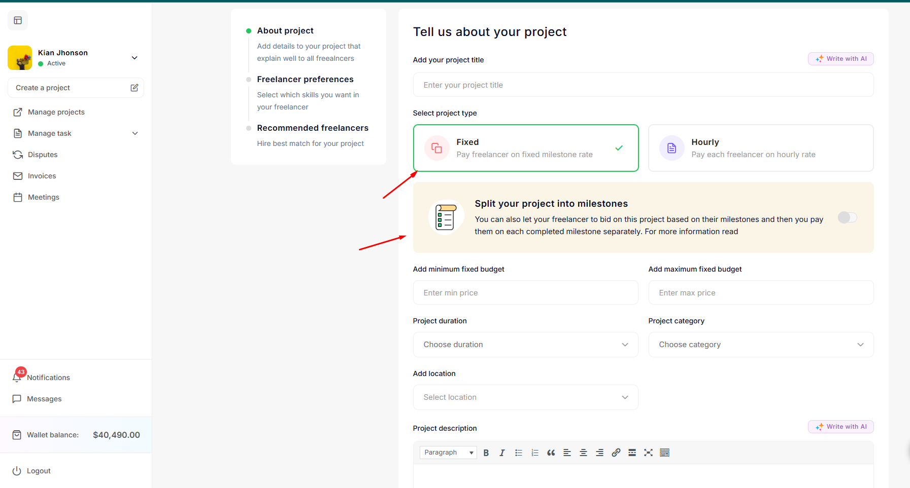 After clicking on any option, the project creation form will be displayed. Here, the employer can update the project details. The employer can choose whether the project will be fixed price or hourly based. If the employer opts for a fixed price project, he can add the option to create milestones for that project. If the employer creates a project based on hourly rates, then the project will operate on an hourly basis. After filling the fields click on Save & continue