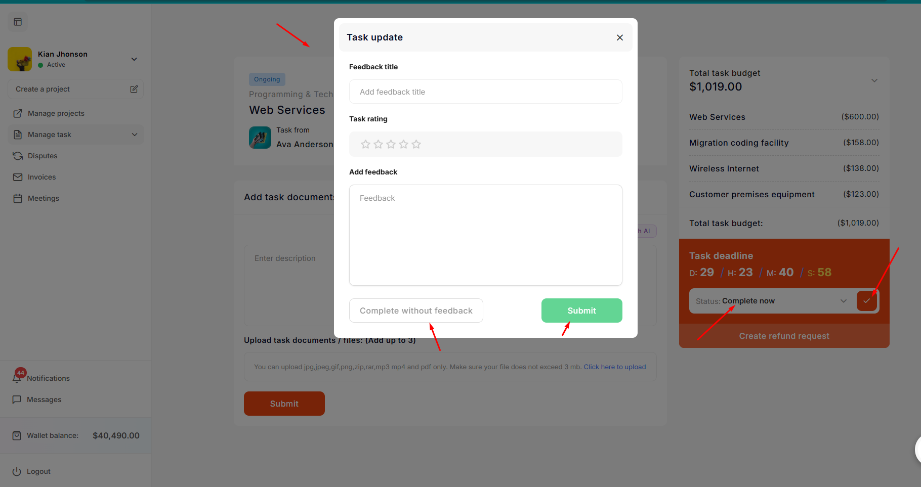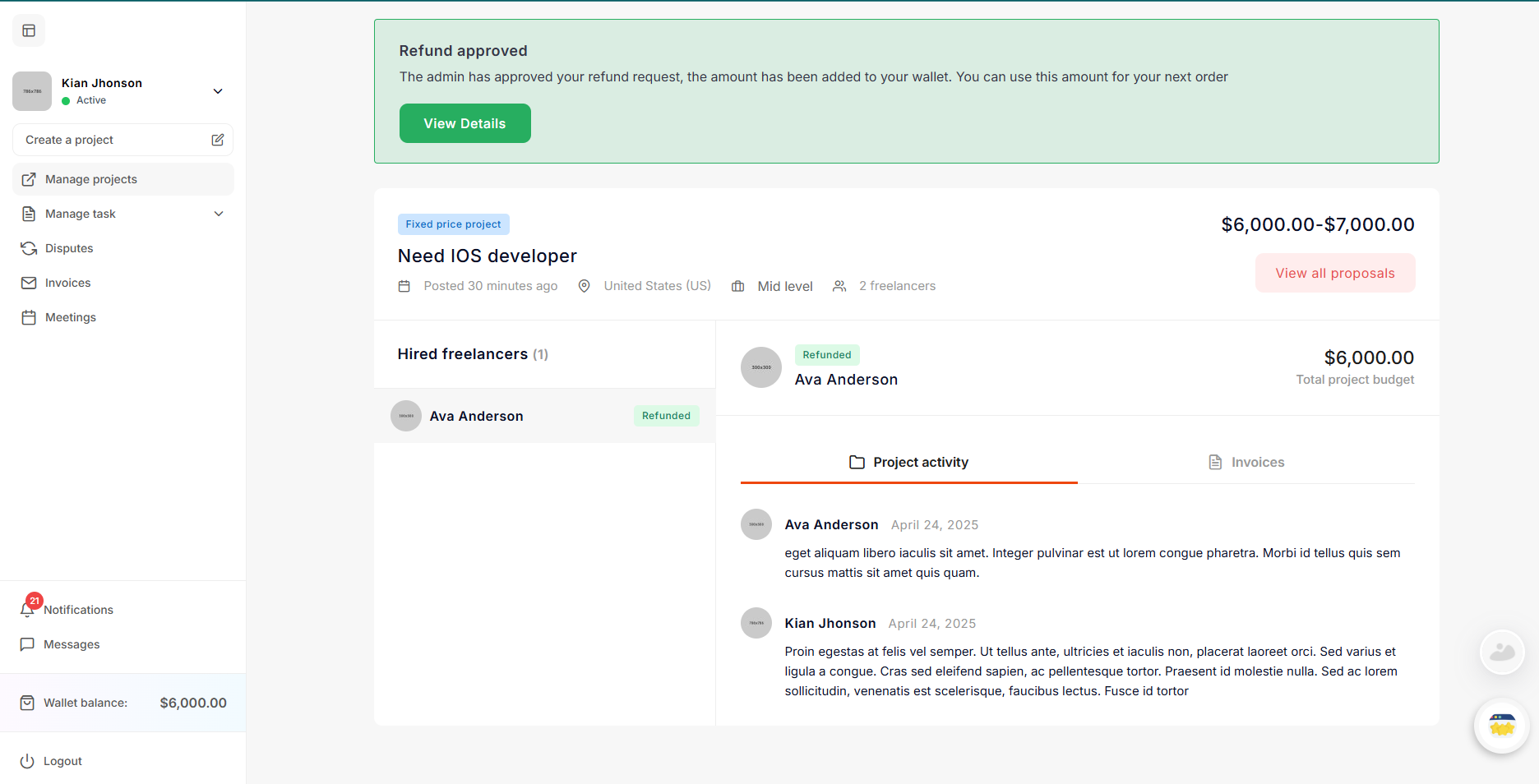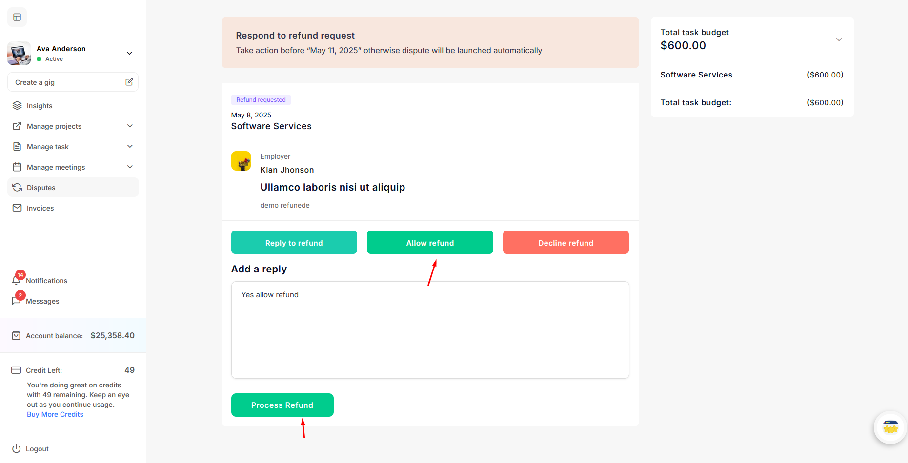 - Allow refund - If the freelancer allows the refund, the money will be deducted from the freelancer's account and transferred to the employer's wallet.