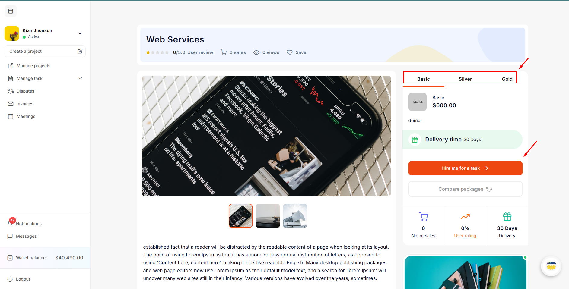 After logging in as an employer, explore the services/tasks and click on the required service/task. The detail page for that service/task will open. Here, the employer can choose a package, such as Basic, Silver, or Gold, according to their needs. Then, click on Hire me for a task.