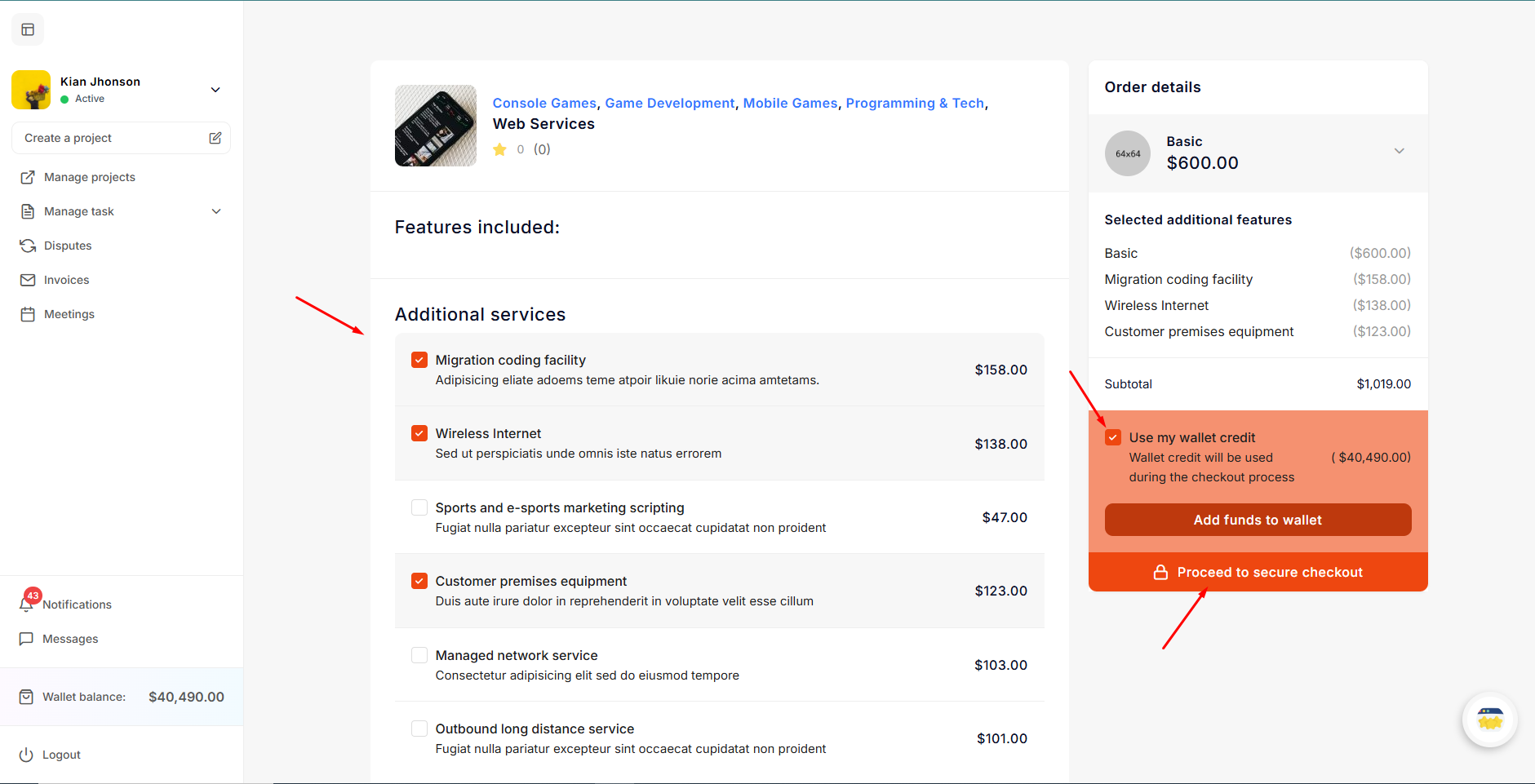 After clicking on the Hire me for a task button, the employer will be redirected to another page where they can choose additional services if needed. After that, the employer can proceed to the checkout process with or without using their wallet. If there is a balance available in their wallet, he can make the payment from his wallet or choose other payment methods.
