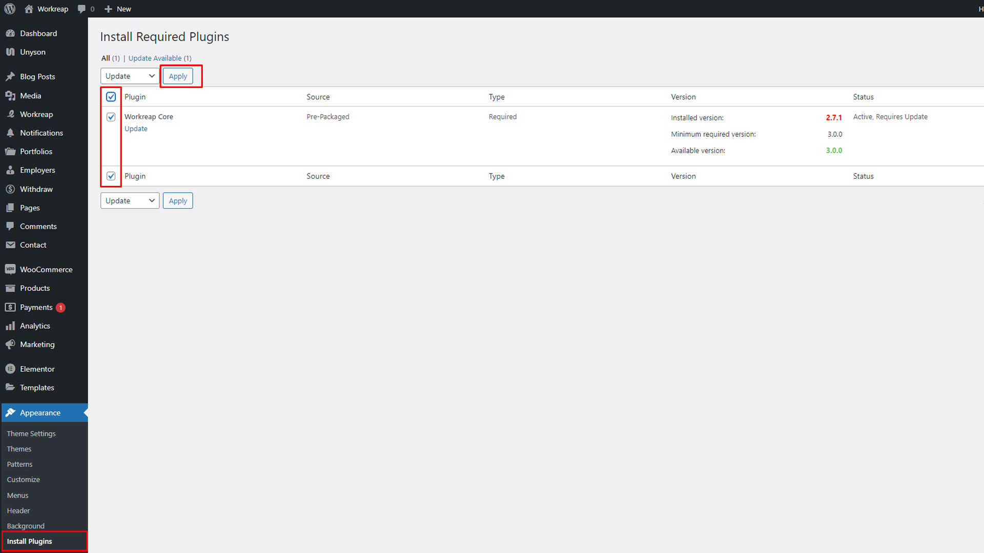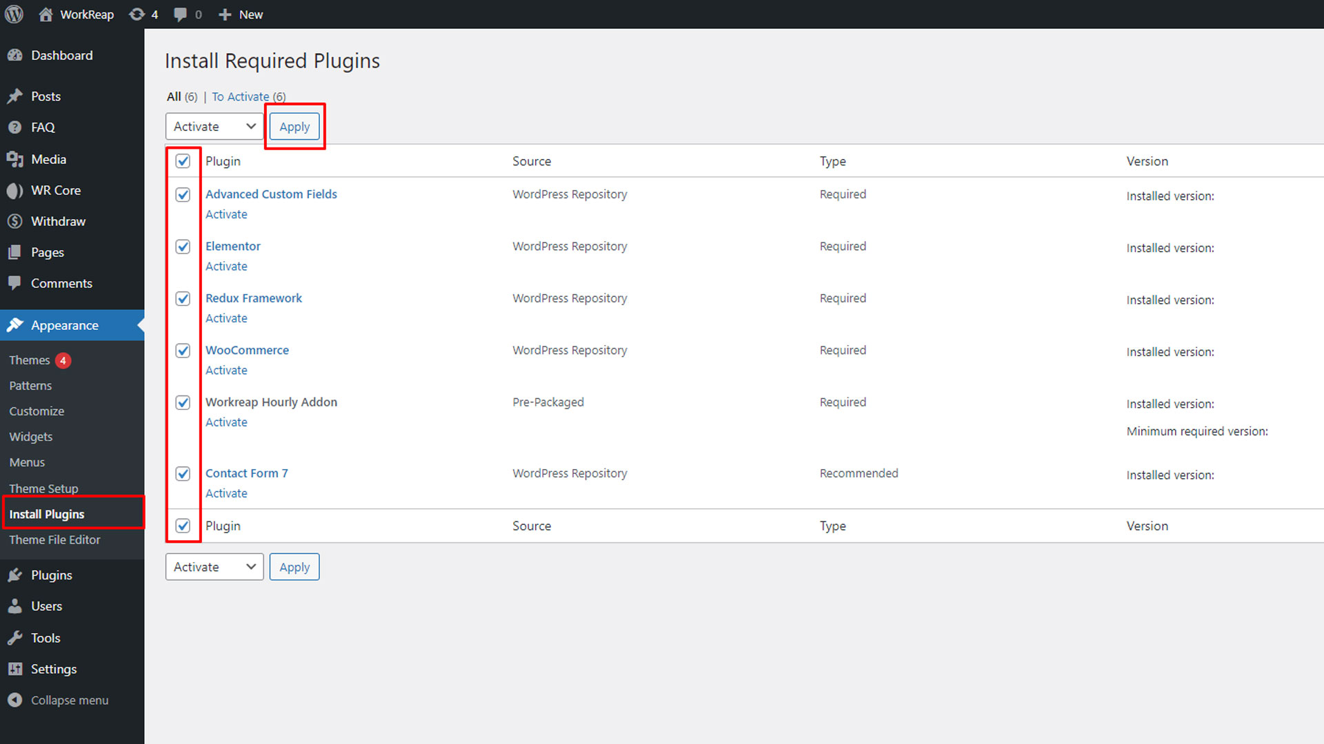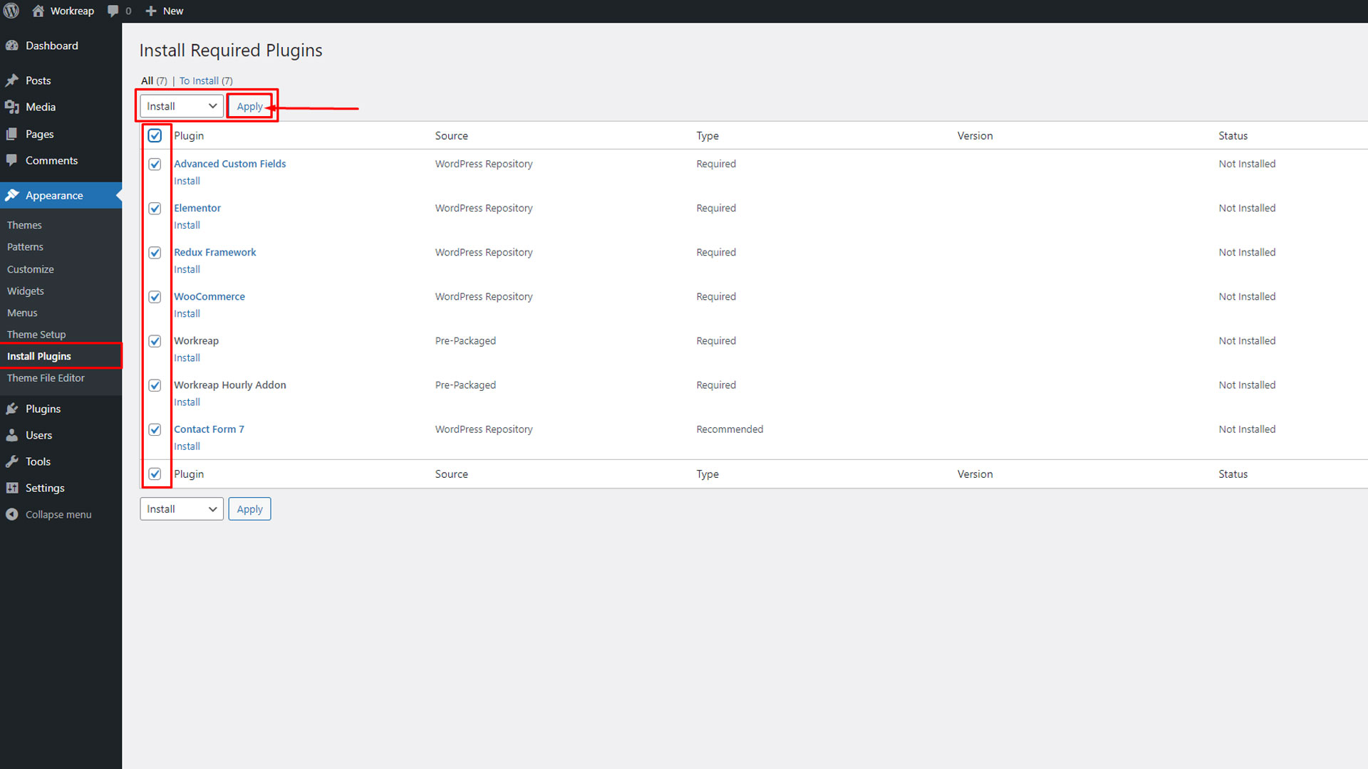 Step 7: After installing the Workreap plugin, you need to install additional required plugins. To do this, go to the WordPress dashboard, navigate to Appearance > Install Plugins, and install/activate all the necessary plugins.