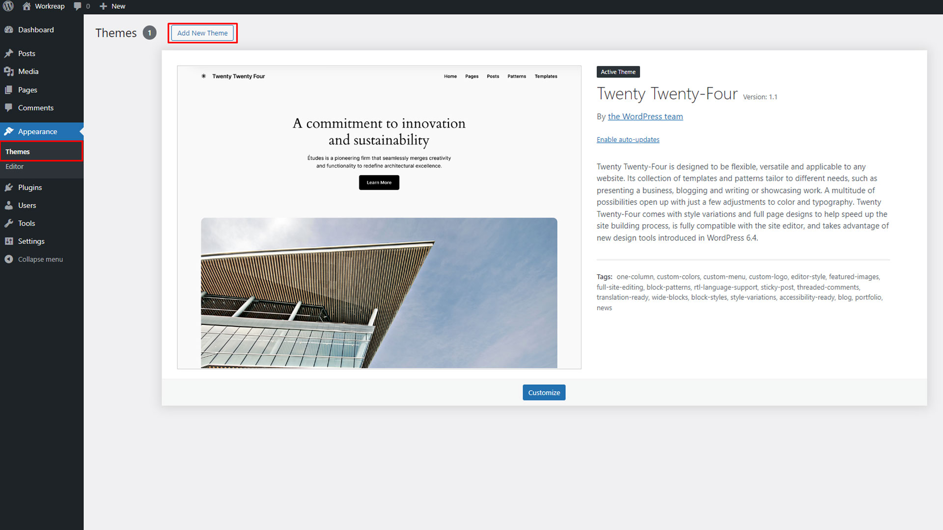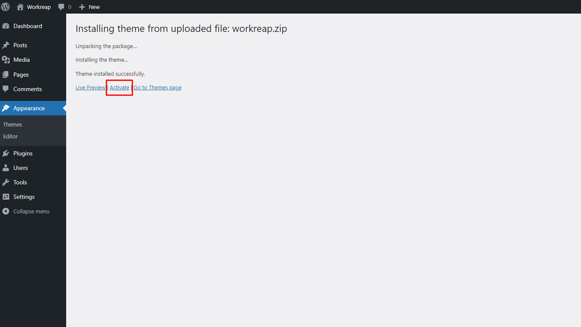 Step 4: To activate the Workreap theme, navigate to Appearance > Themes and click on the "Activate" button.