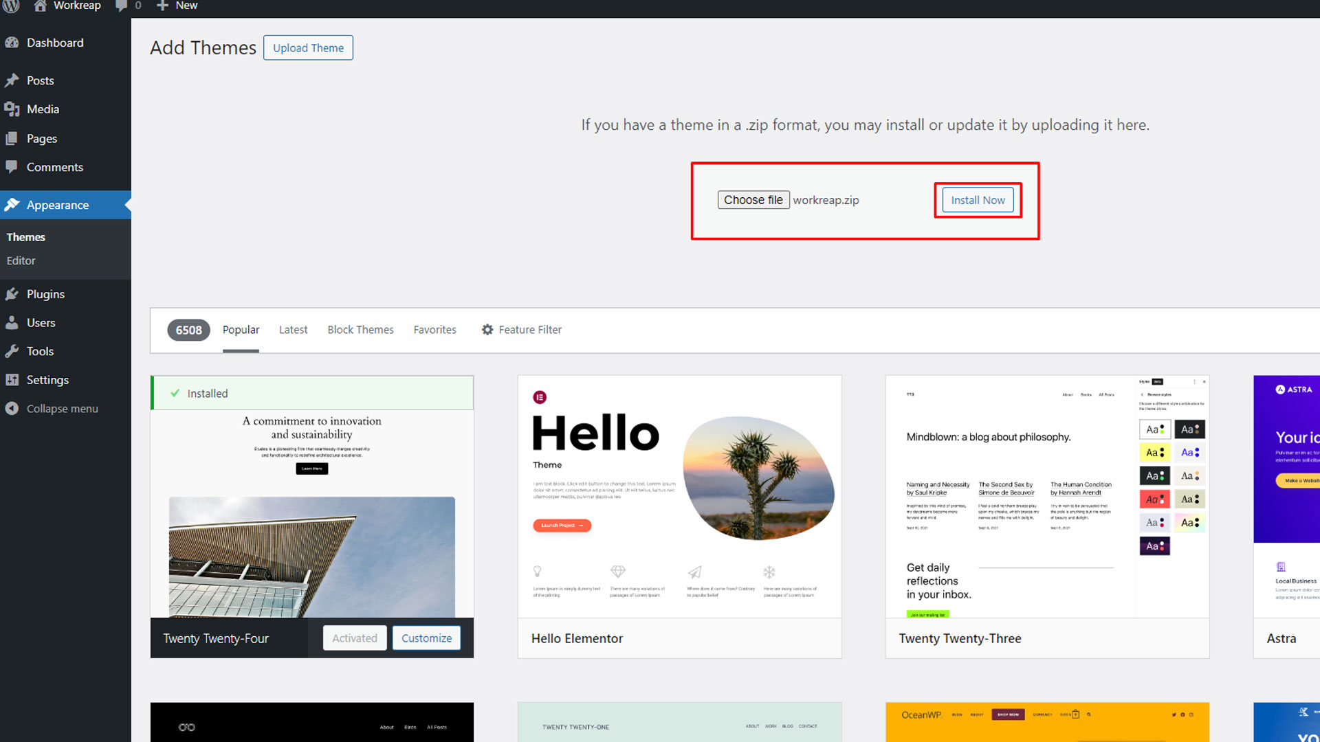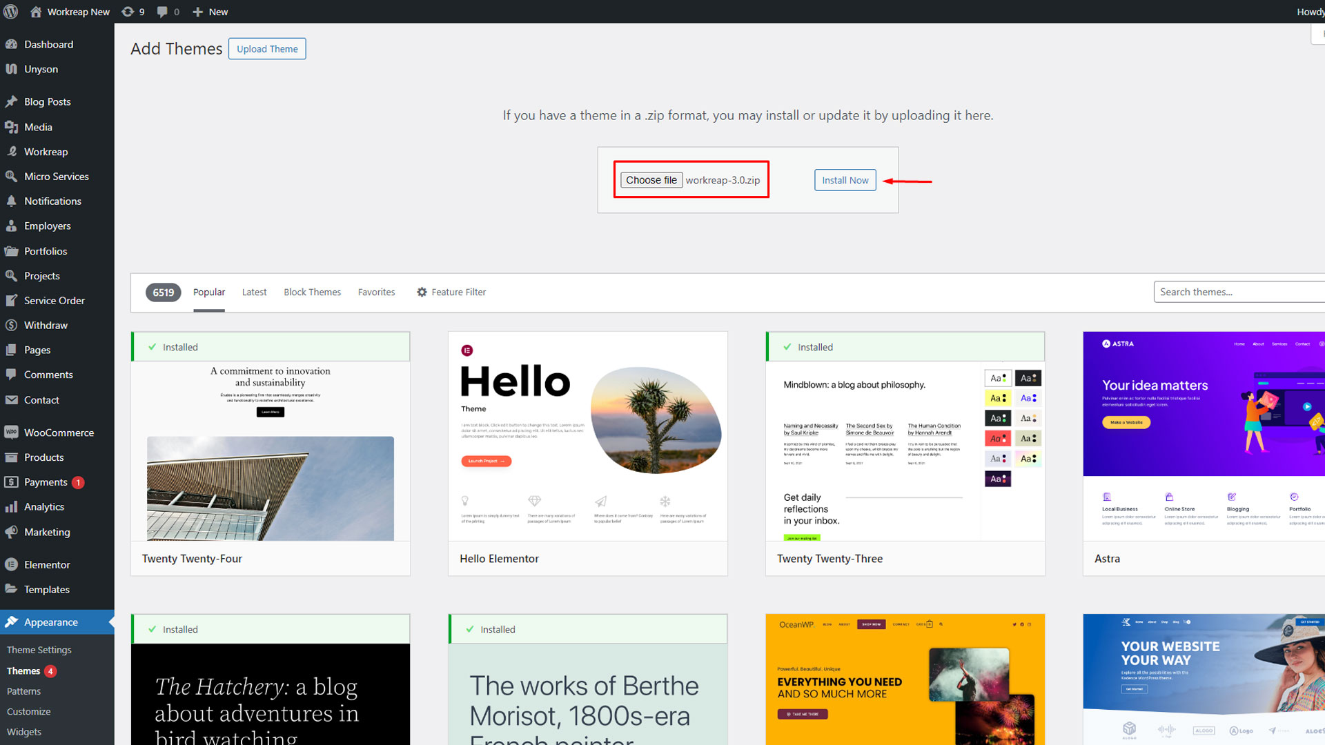 Step 3: Select the "workreap.zip file (downloaded from ThemeForest) from your computer, then click on the "Install Now" button.