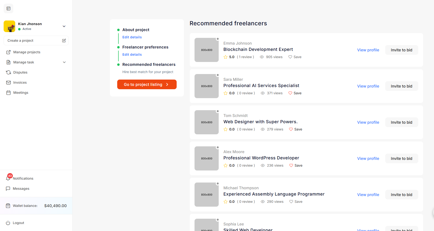 On that screen, the employer can invite freelancers to bid on the project or simply go to the project listings.