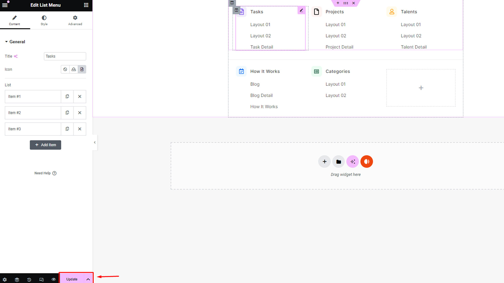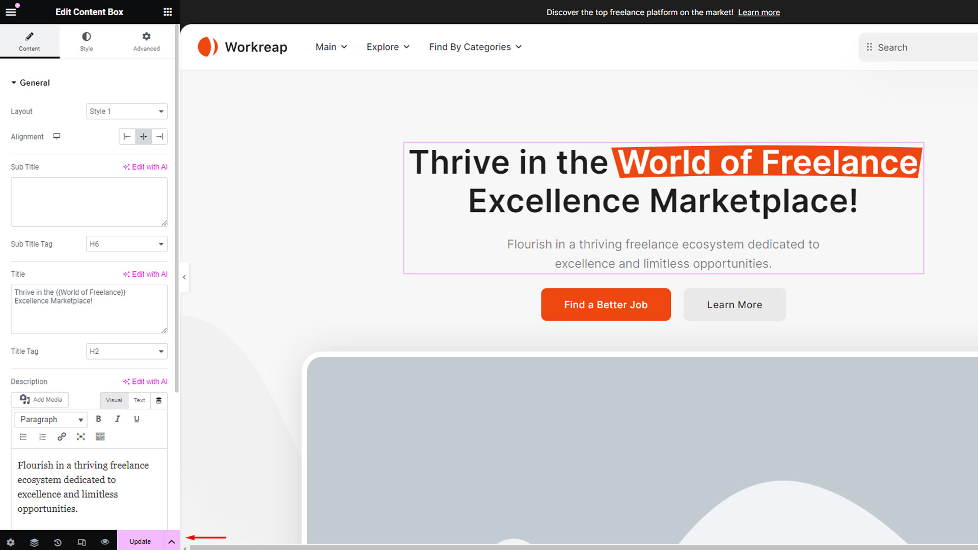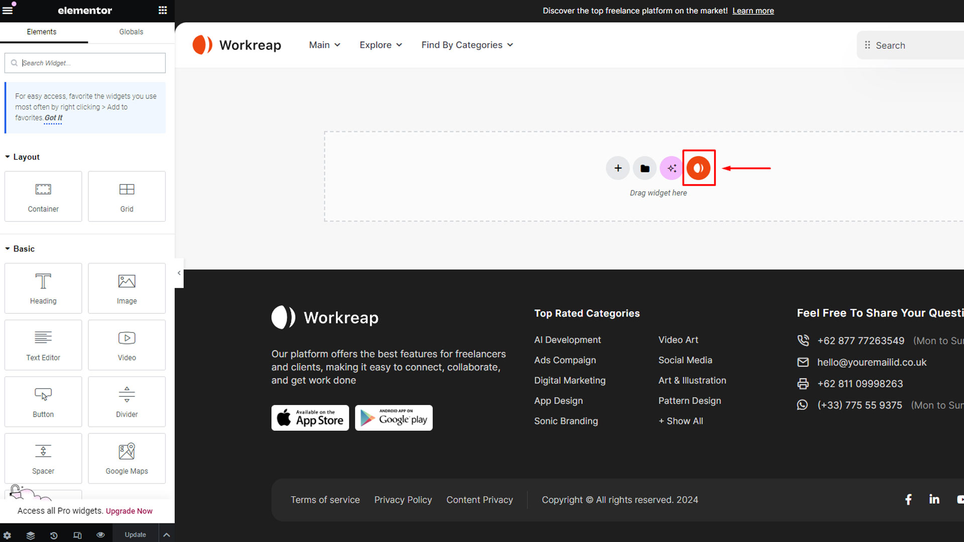 Step 1:In the Elementor editor, users will find the Workreap icon. Clicking on this icon opens the library popup.